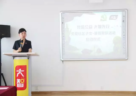 07月24日,由濟南市歷下區(qū)解放路街道黨工委聯合大智小班黨支部發(fā)起的“黨員公益 大智先行——關愛社區(qū)子女”暑假幫扶活動啟動儀式在大智控股集團總部舉行。解放路街道青龍街社區(qū)居委會副主任張蕊等領導,大智控股集團黨委委員、濟南區(qū)域總校長宋靜文,接受幫扶的社區(qū)家長和孩子以及小班黨支部代表參加了儀式。