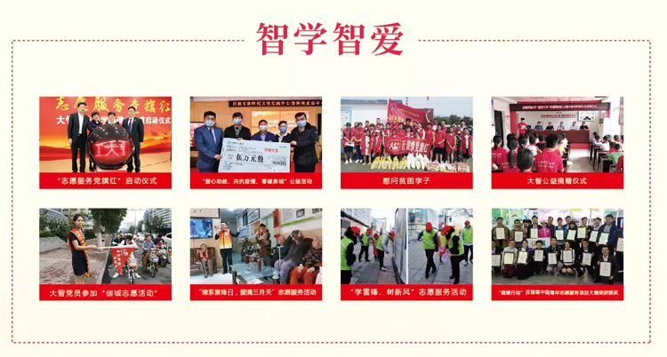 多年來(lái),在上級(jí)主管部門領(lǐng)導(dǎo)下,大智教育集團(tuán)積極踐行社會(huì)責(zé)任,把公益基因植入企業(yè)發(fā)展之中,啟動(dòng)了“黨員公益 大智先行”“千校巡講”“大智之星”齊魯學(xué)子獎(jiǎng)學(xué)金評(píng)選等公益項(xiàng)目,建立了“智學(xué)智愛”志愿服務(wù)隊(duì),積極參與到全國(guó)文明城市創(chuàng)建、泉城義工、抗疫援助等活動(dòng)中來(lái),形成了“智惠e”公益品牌。