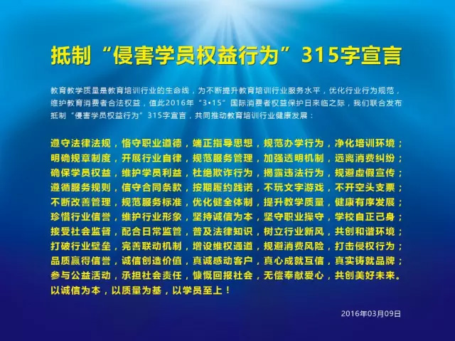 研討會(huì)上,教育培訓(xùn)機(jī)構(gòu)共同發(fā)起了抵制“侵害學(xué)員權(quán)益行為”315字宣言:
