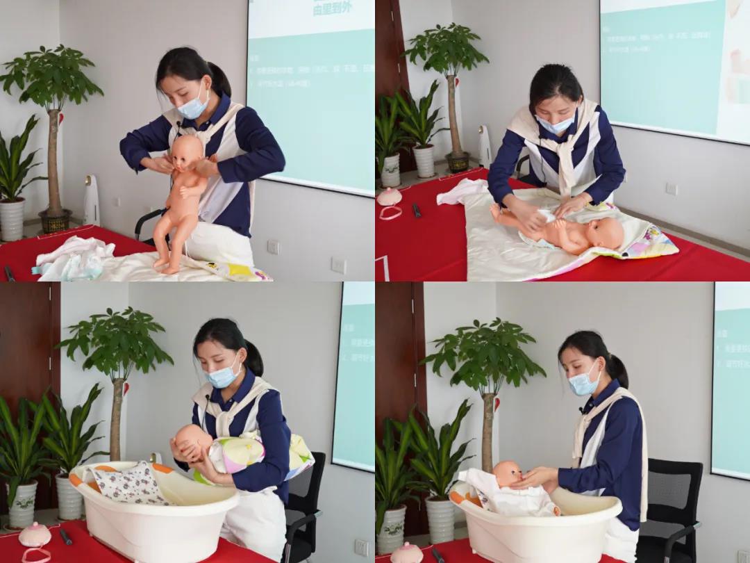兩位老師分別從分娩前期準備以及后期的新生兒護理等方面進行了詳細講解,并在現(xiàn)場進行示范指導。