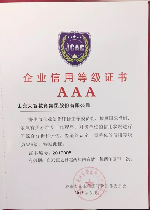企業(yè)信譽評價是“誠信濟南”建設的重要組成部分,最終評價結果代表了企業(yè)真實的信譽狀況。此次大智教育集團以優(yōu)質的教學服務和誠信經營的品質,被評定為企業(yè)信用AAA級,這是對大智的充分認可與鼓勵。