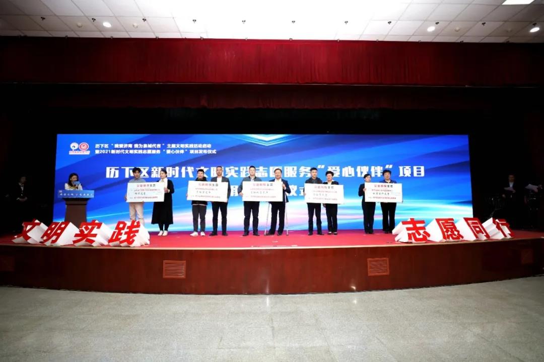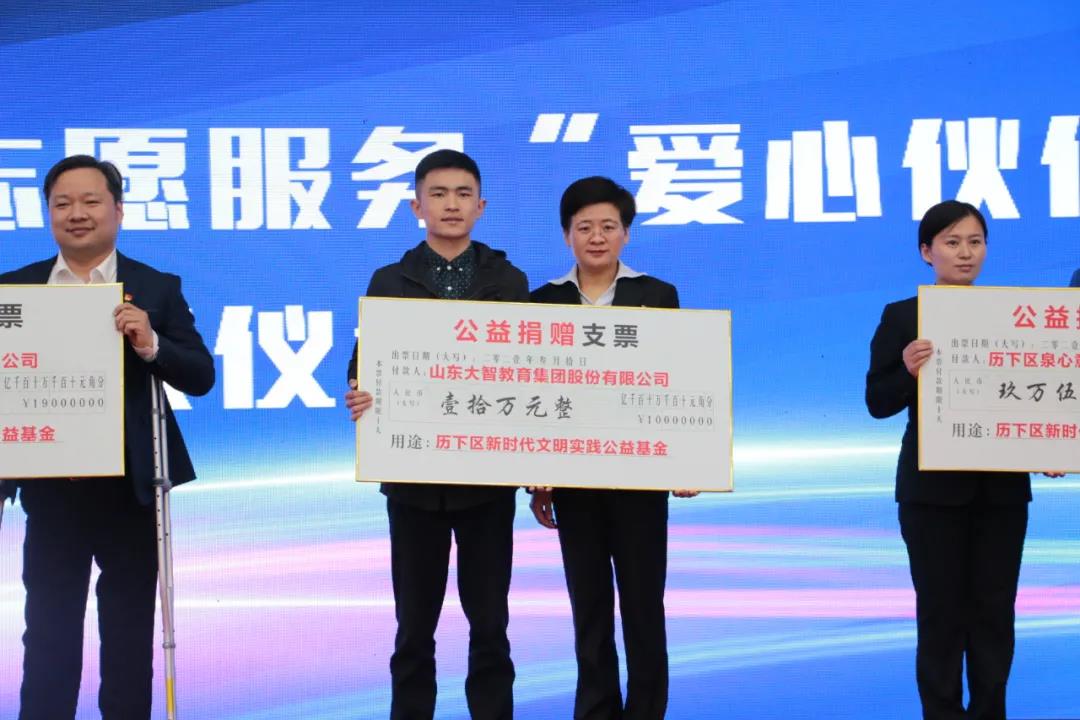 愛心伙伴項(xiàng)目捐助認(rèn)領(lǐng)儀式上,山東大智教育集團(tuán)股份有限公司等五組愛心伙伴企業(yè)負(fù)責(zé)人為志愿服務(wù)團(tuán)隊(duì)代表進(jìn)行捐贈(zèng)。其中大智教育集團(tuán)為歷下區(qū)新時(shí)代文明實(shí)踐公益基金捐贈(zèng)10萬元。