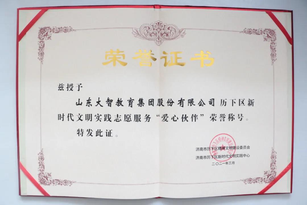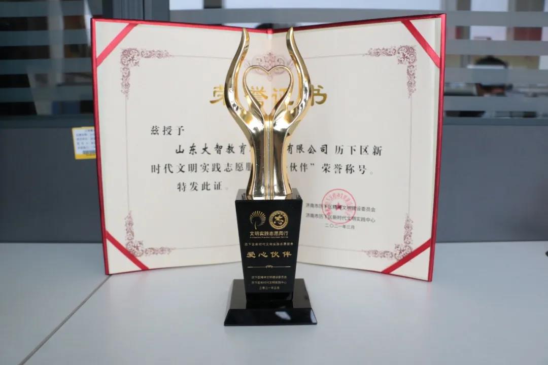 濟(jì)南市歷下區(qū)精神建設(shè)委員會(huì)和濟(jì)南市歷下區(qū)新時(shí)代文明實(shí)踐中心授予山東大智教育集團(tuán)有限公司歷下區(qū)新時(shí)代文明實(shí)踐志愿服務(wù)“愛心伙伴”稱號(hào),并授予了榮譽(yù)獎(jiǎng)杯及證書。