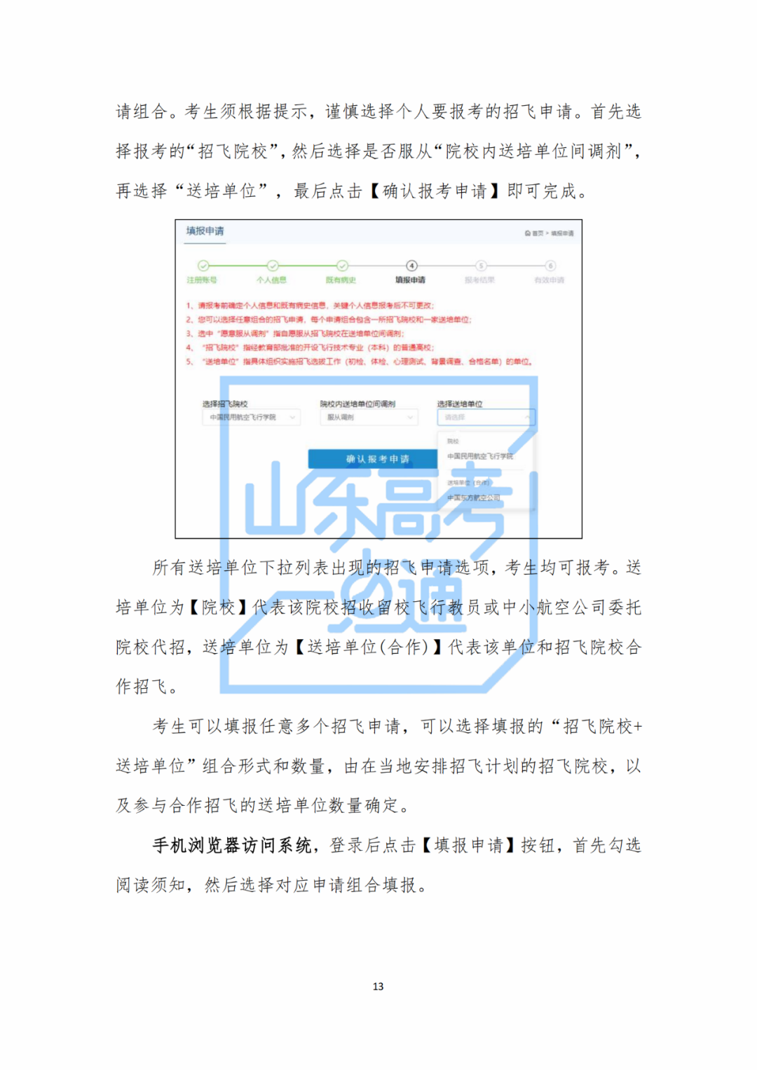 送培單位在招飛院校的組織下開展招飛工作。送培單位的招飛主管將聯(lián)系您參加各項選拔工作,并在招飛系統(tǒng)中對您報考本單位的相關(guān)信息及結(jié)果進行設(shè)置、審核、跟蹤等。請注意,當(dāng)您在招飛系統(tǒng)中選擇的送培單位為招飛院校時,表示您畢業(yè)后的工作單位由招飛院校負(fù)責(zé)確定,或者留在學(xué)校成為飛行教員,由招飛院校的招飛主管負(fù)責(zé)您的選拔工作。當(dāng)您在招飛系統(tǒng)中選擇送培單位為送培單位(合作)時,表明在您的生源地送培單位由招飛院校主導(dǎo)參與合作招飛,由送培單位的招飛主管經(jīng)招飛院校授權(quán)后,負(fù)責(zé)您的選拔工作。