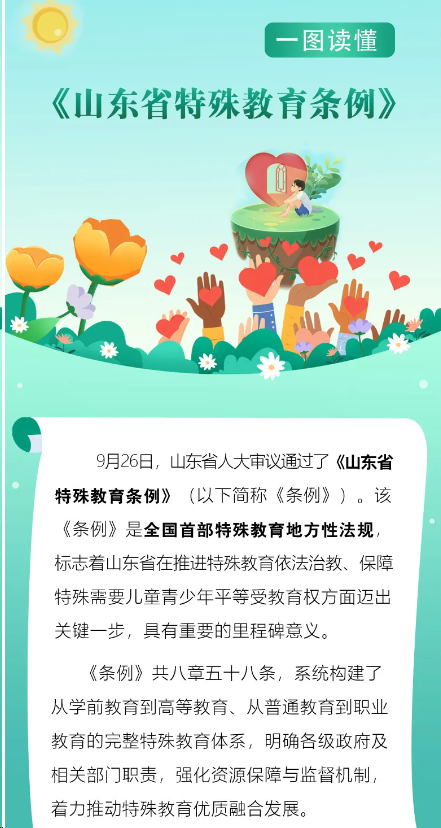 9月26日,山東省第十四屆人民代表大會(huì)常務(wù)委員會(huì)第十七次會(huì)議通過(guò)了《山東省特殊教育條例》?!稐l例》自2026年1月1日起施行,一起來(lái)看具體內(nèi)...