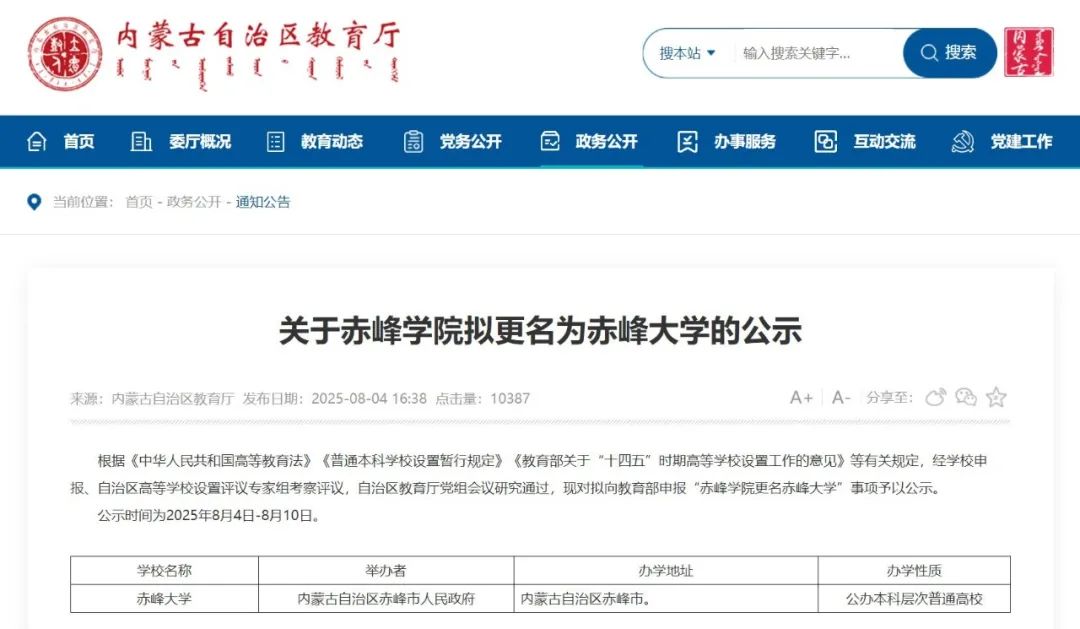 8月4日,內(nèi)蒙古自治區(qū)教育廳、浙江省教育廳發(fā)布高校更名公示,赤峰學院、紹興文理學院、湖州師范學院3所高校擬更名為赤峰大學、紹興大學、湖州師范...
