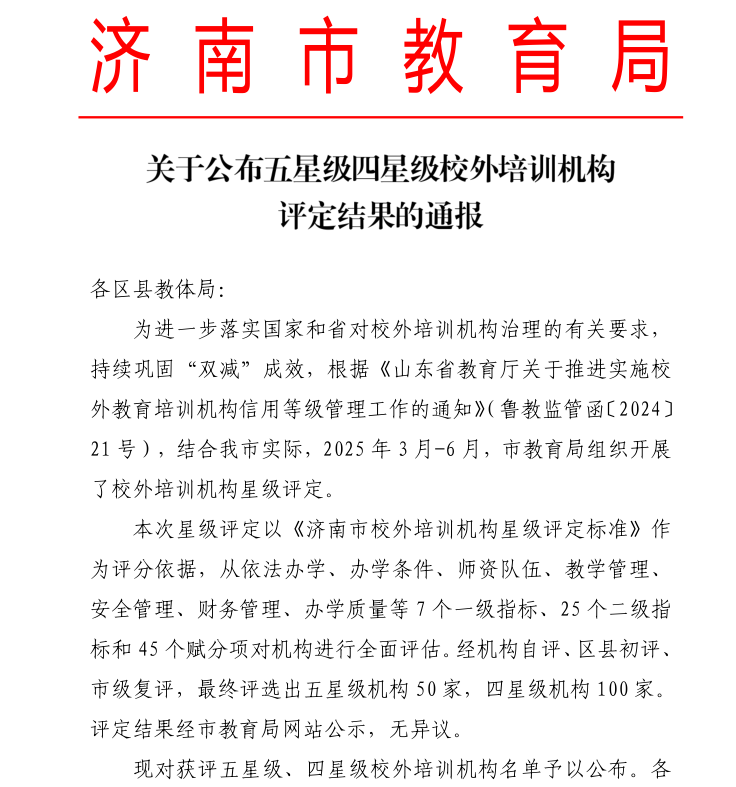 近日,濟(jì)南市教育局發(fā)布《關(guān)于公布五星級(jí)四星級(jí)校外培訓(xùn)機(jī)構(gòu)評(píng)定結(jié)果的通報(bào)》,大智12所分校憑借規(guī)范辦學(xué)、優(yōu)質(zhì)服務(wù)和卓越教學(xué)成果上榜,彰顯了深耕...