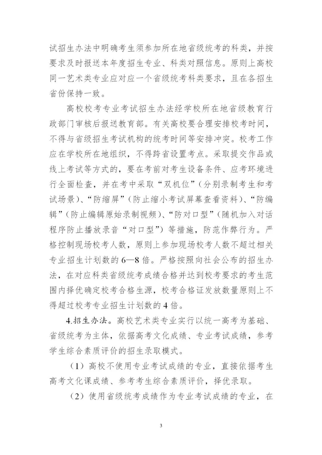 3.平穩(wěn)做好藝術(shù)類考試招生。各地要認(rèn)真落實藝術(shù)類專業(yè)考試招生改革部署,進(jìn)一步加強(qiáng)省級統(tǒng)考能力建設(shè),考試科類基本實現(xiàn)全覆蓋。要對照有關(guān)工作規(guī)范,完善省級統(tǒng)考科目和內(nèi)容,優(yōu)化考試組織和流程,推進(jìn)省級統(tǒng)考提質(zhì)增效。要科學(xué)制定藝術(shù)類專業(yè)招生錄取辦法,確保改革平穩(wěn)落地。少數(shù)專業(yè)特色鮮明、人才培養(yǎng)質(zhì)量較高的藝術(shù)院校,經(jīng)省級教育行政部門批準(zhǔn)可在省級統(tǒng)考基礎(chǔ)上組織個別專業(yè)??肌S嘘P(guān)高校要結(jié)合人才培養(yǎng)定位,科學(xué)制定??紝I(yè)考試招生辦法,加強(qiáng)與省級統(tǒng)考銜接,合理確定??夹问郊皟?nèi)容。2024年起,高校高水平藝術(shù)團(tuán)不再從高校招生環(huán)節(jié)選拔,由有關(guān)高校從在校生中遴選培養(yǎng)。