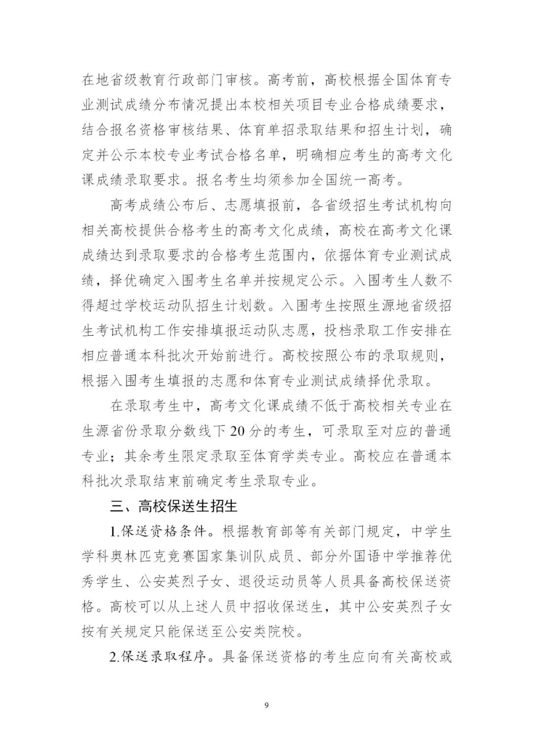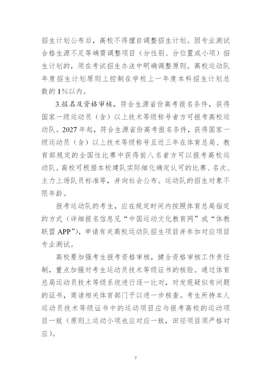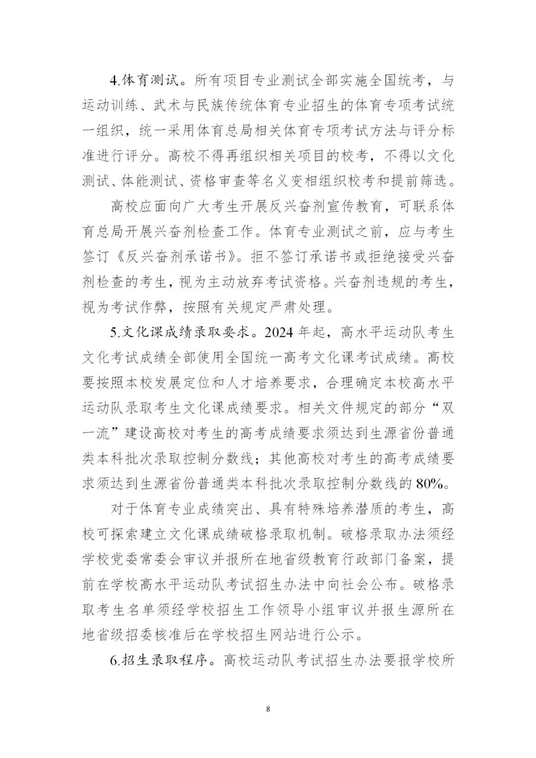 4.平穩(wěn)做好高水平運(yùn)動隊考試招生。有關(guān)高校要緊緊圍繞高水平運(yùn)動隊工作定位,根據(jù)學(xué)校運(yùn)動隊建設(shè)規(guī)劃,優(yōu)化招生項目范圍。要嚴(yán)格招生程序,完善評價辦法和招生錄取機(jī)制,合理確定文化成績要求。2024年起,高水平運(yùn)動隊考生文化考試成績?nèi)渴褂萌珖y(tǒng)一高考文化課考試成績;專業(yè)測試全部納入全國統(tǒng)考,由體育總局牽頭組織實施,高校不再組織相關(guān)???。