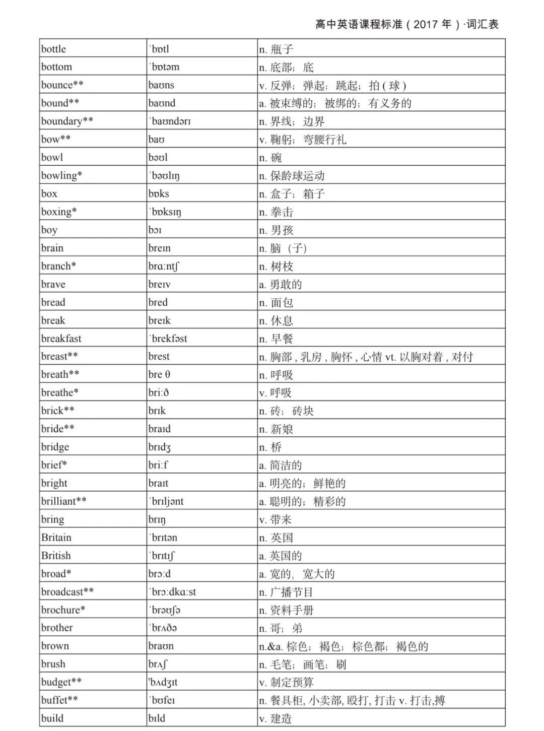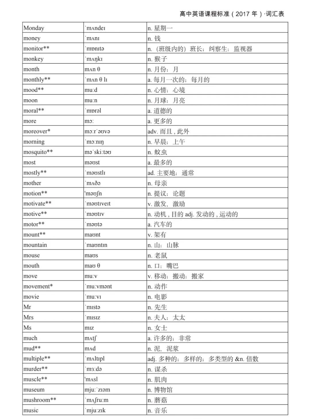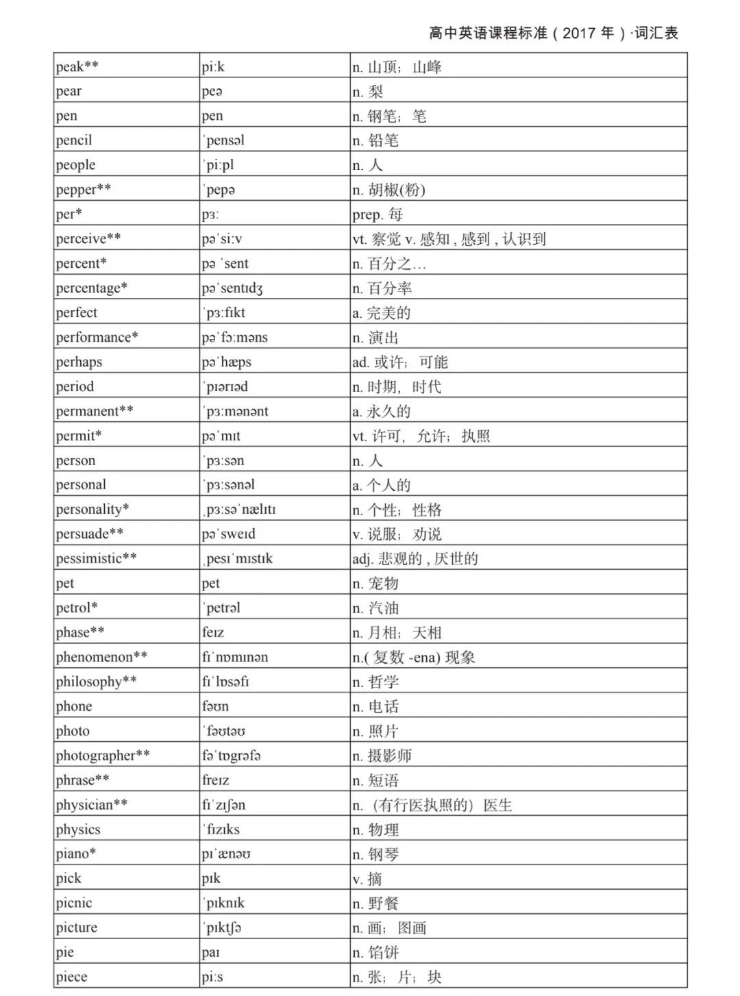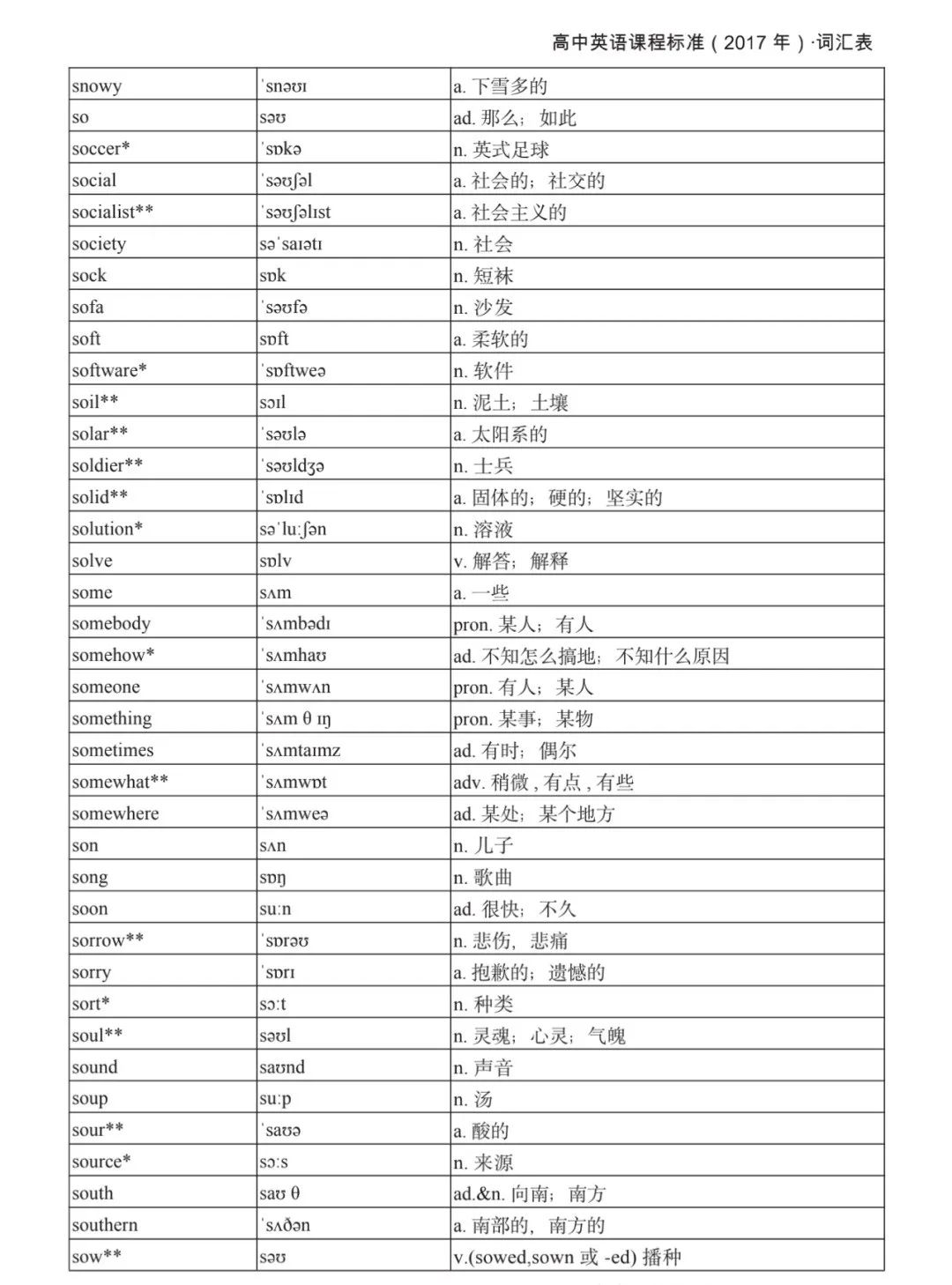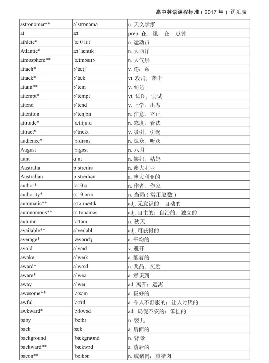 本詞匯表共收 3000 個單詞,含義務(wù)教育階段要求掌握的 1500 個單詞。高中英語必修課程應(yīng)學(xué)習(xí)和掌握 500 個單詞(表中加有一個 * 號),累計達 2000。選擇性必修課程應(yīng)學(xué)習(xí)和掌握 1000 個單詞(表中加有兩個 *號),累計達 3000。各地可根據(jù)實際情況在本詞匯表所收詞的基礎(chǔ)上,再選擇增加 200 個單詞。
