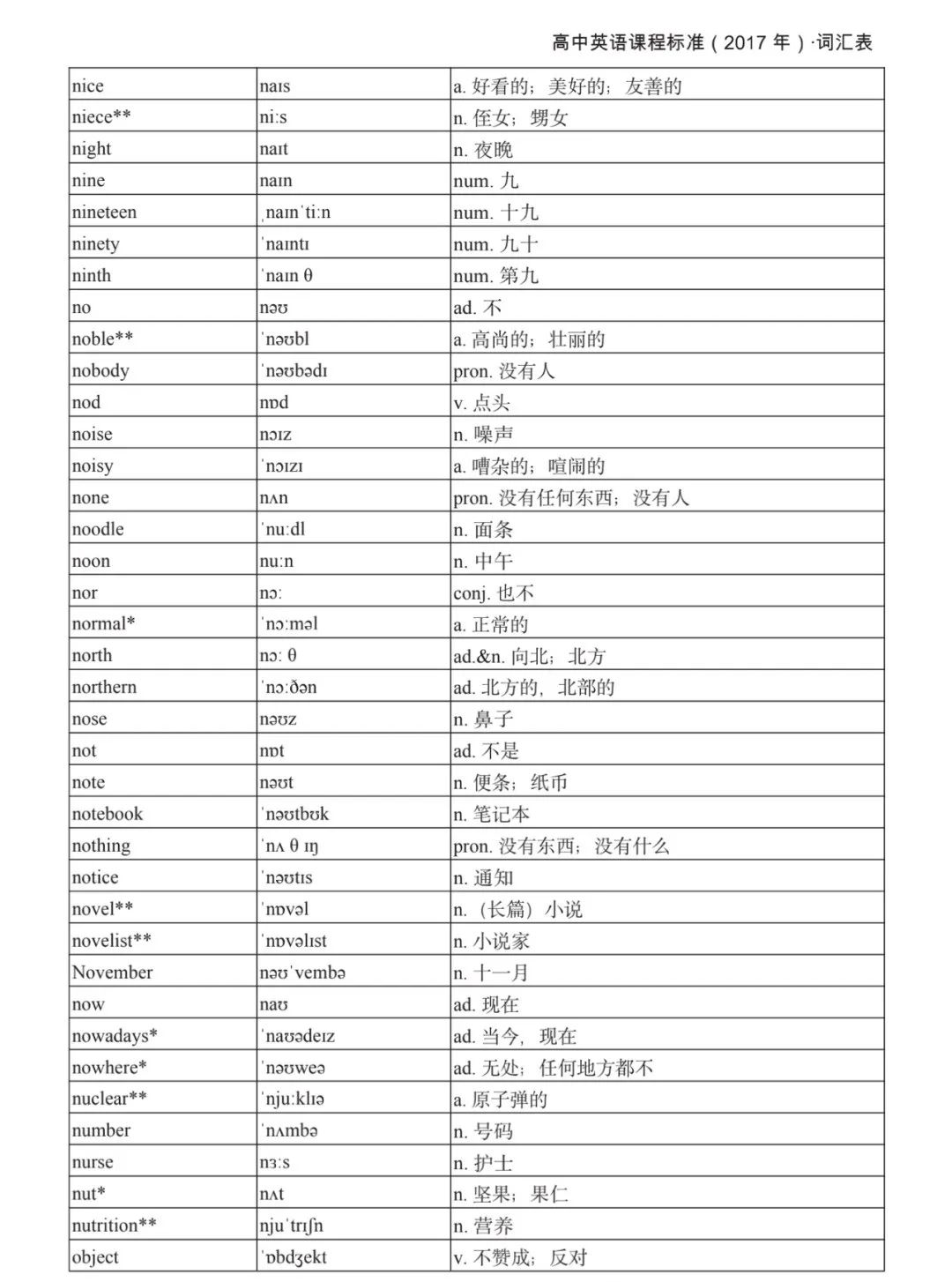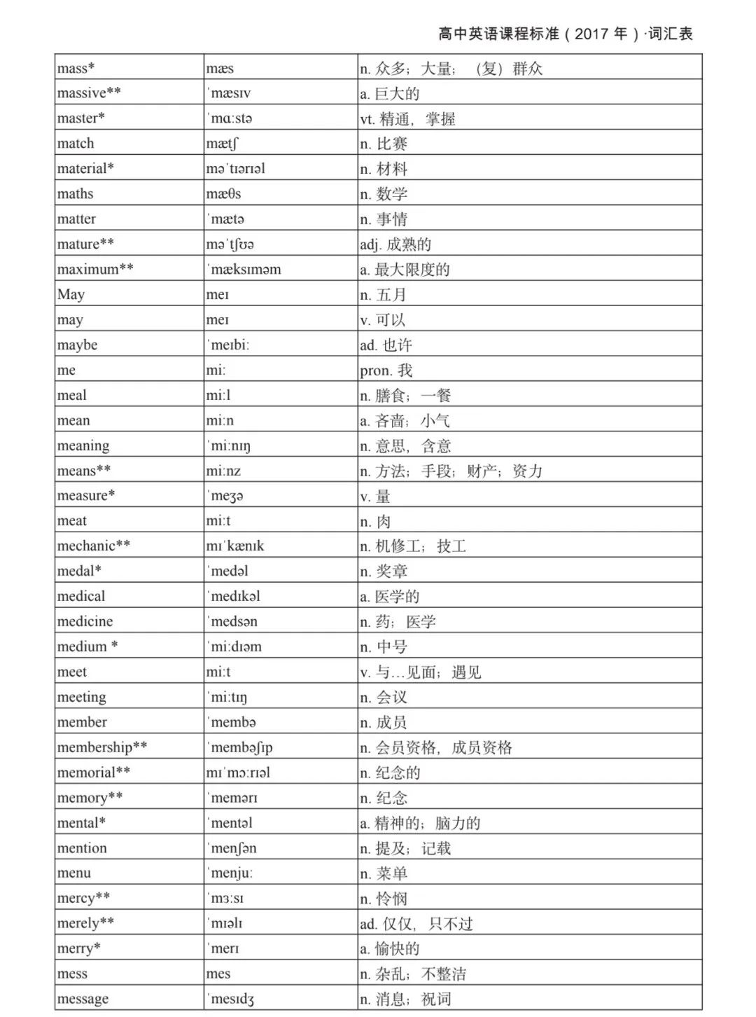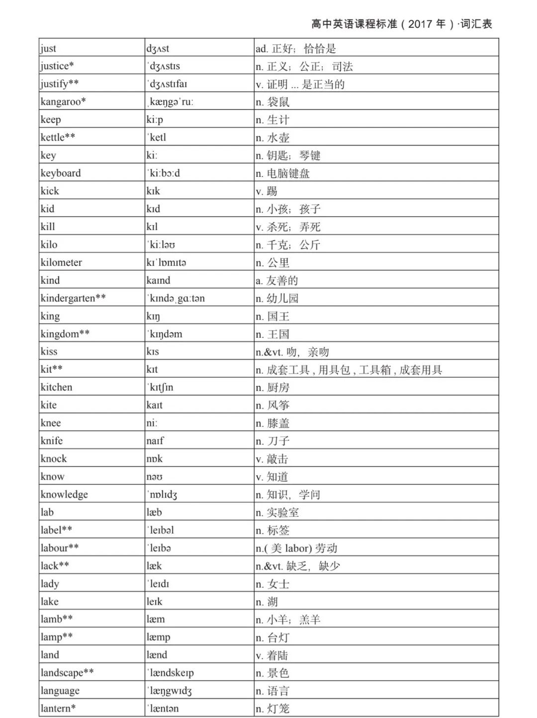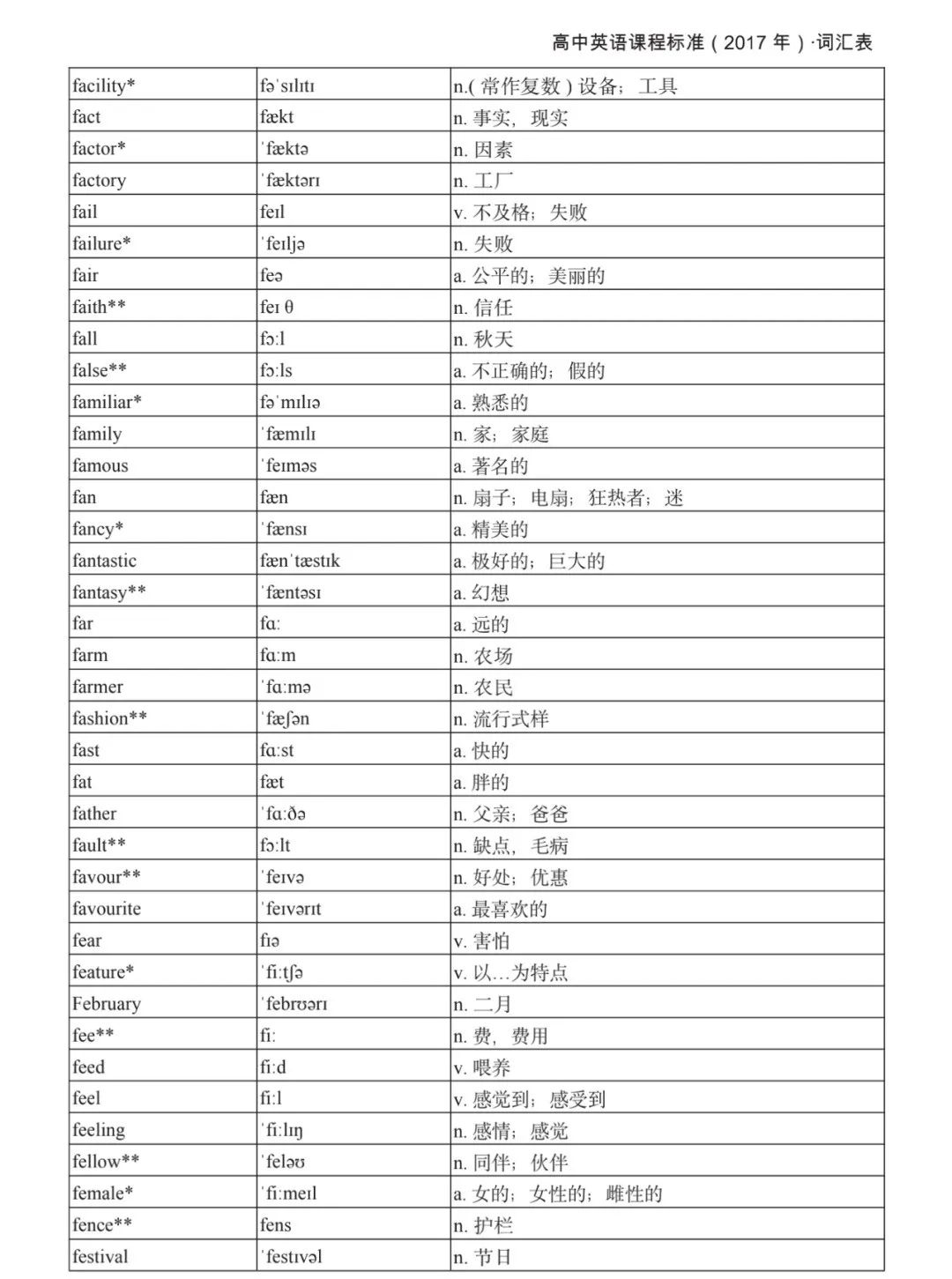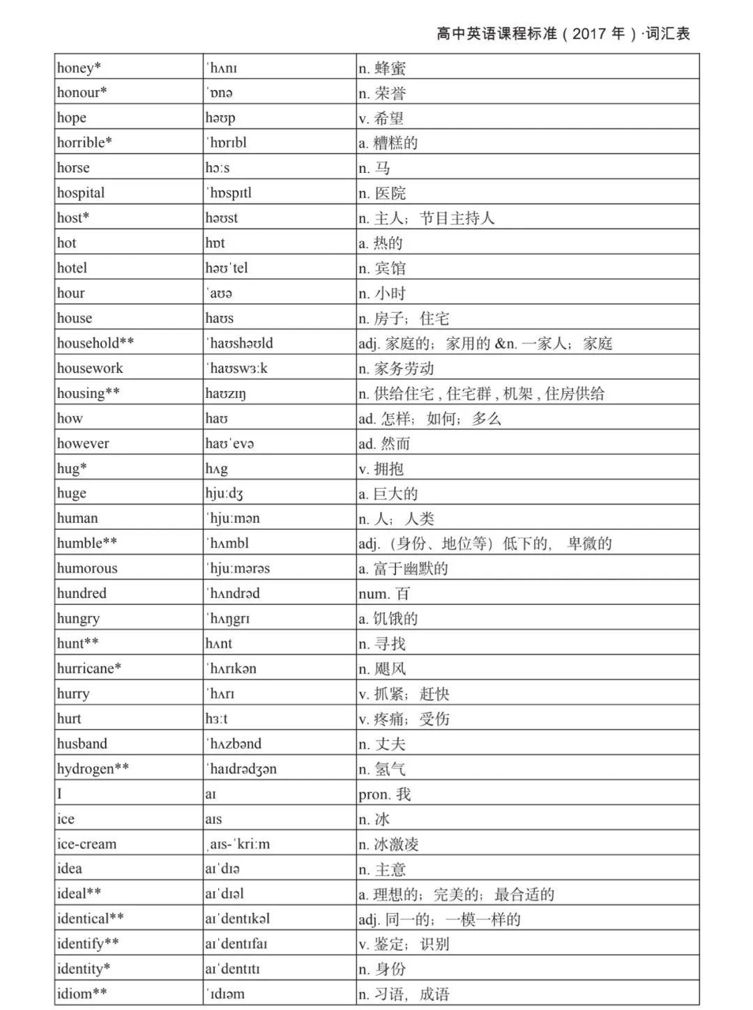 本詞匯表共收 3000 個單詞,含義務(wù)教育階段要求掌握的 1500 個單詞。高中英語必修課程應(yīng)學(xué)習(xí)和掌握 500 個單詞(表中加有一個 * 號),累計達 2000。選擇性必修課程應(yīng)學(xué)習(xí)和掌握 1000 個單詞(表中加有兩個 *號),累計達 3000。各地可根據(jù)實際情況在本詞匯表所收詞的基礎(chǔ)上,再選擇增加 200 個單詞。