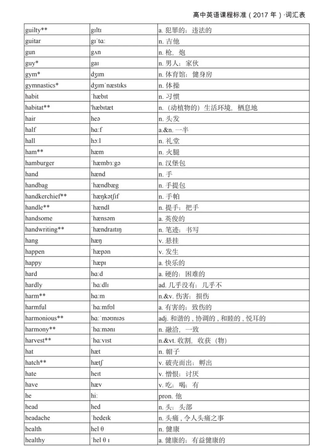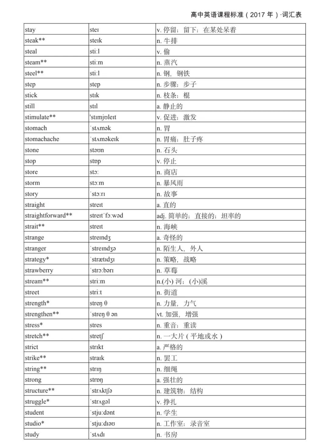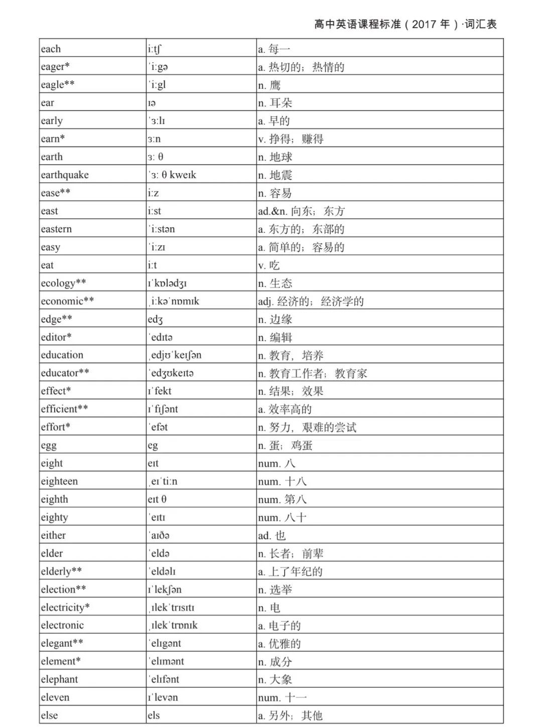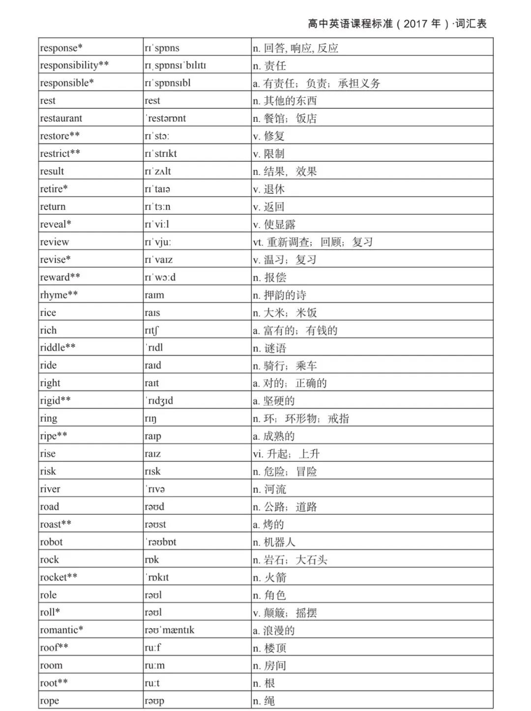 本詞匯表共收 3000 個單詞,含義務(wù)教育階段要求掌握的 1500 個單詞。高中英語必修課程應(yīng)學(xué)習(xí)和掌握 500 個單詞(表中加有一個 * 號),累計達 2000。選擇性必修課程應(yīng)學(xué)習(xí)和掌握 1000 個單詞(表中加有兩個 *號),累計達 3000。各地可根據(jù)實際情況在本詞匯表所收詞的基礎(chǔ)上,再選擇增加 200 個單詞。