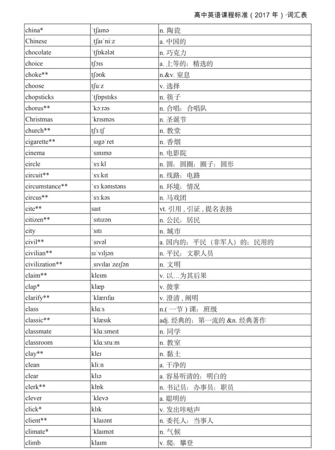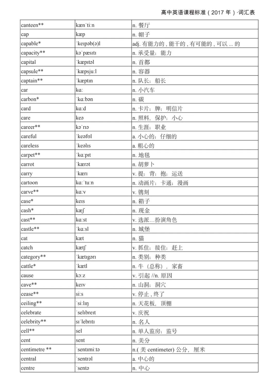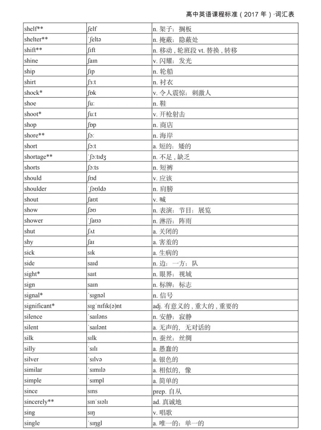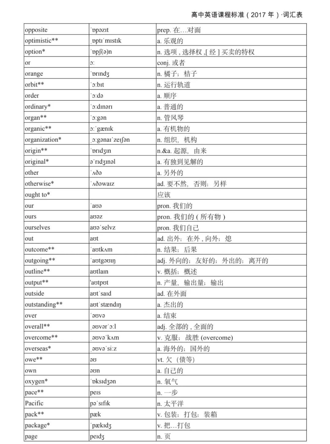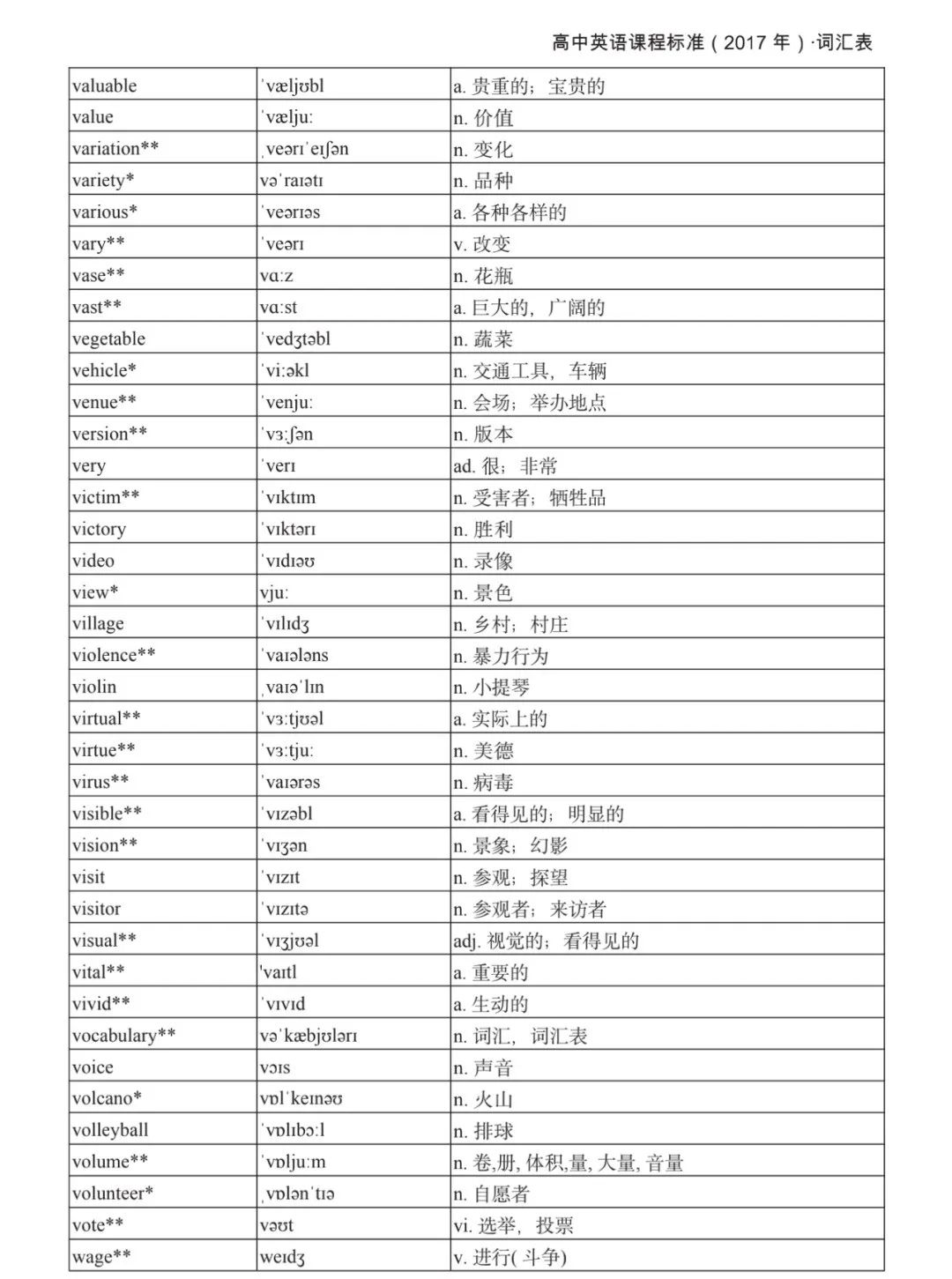 本詞匯表共收 3000 個單詞,含義務(wù)教育階段要求掌握的 1500 個單詞。高中英語必修課程應(yīng)學(xué)習(xí)和掌握 500 個單詞(表中加有一個 * 號),累計達 2000。選擇性必修課程應(yīng)學(xué)習(xí)和掌握 1000 個單詞(表中加有兩個 *號),累計達 3000。各地可根據(jù)實際情況在本詞匯表所收詞的基礎(chǔ)上,再選擇增加 200 個單詞。