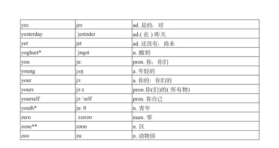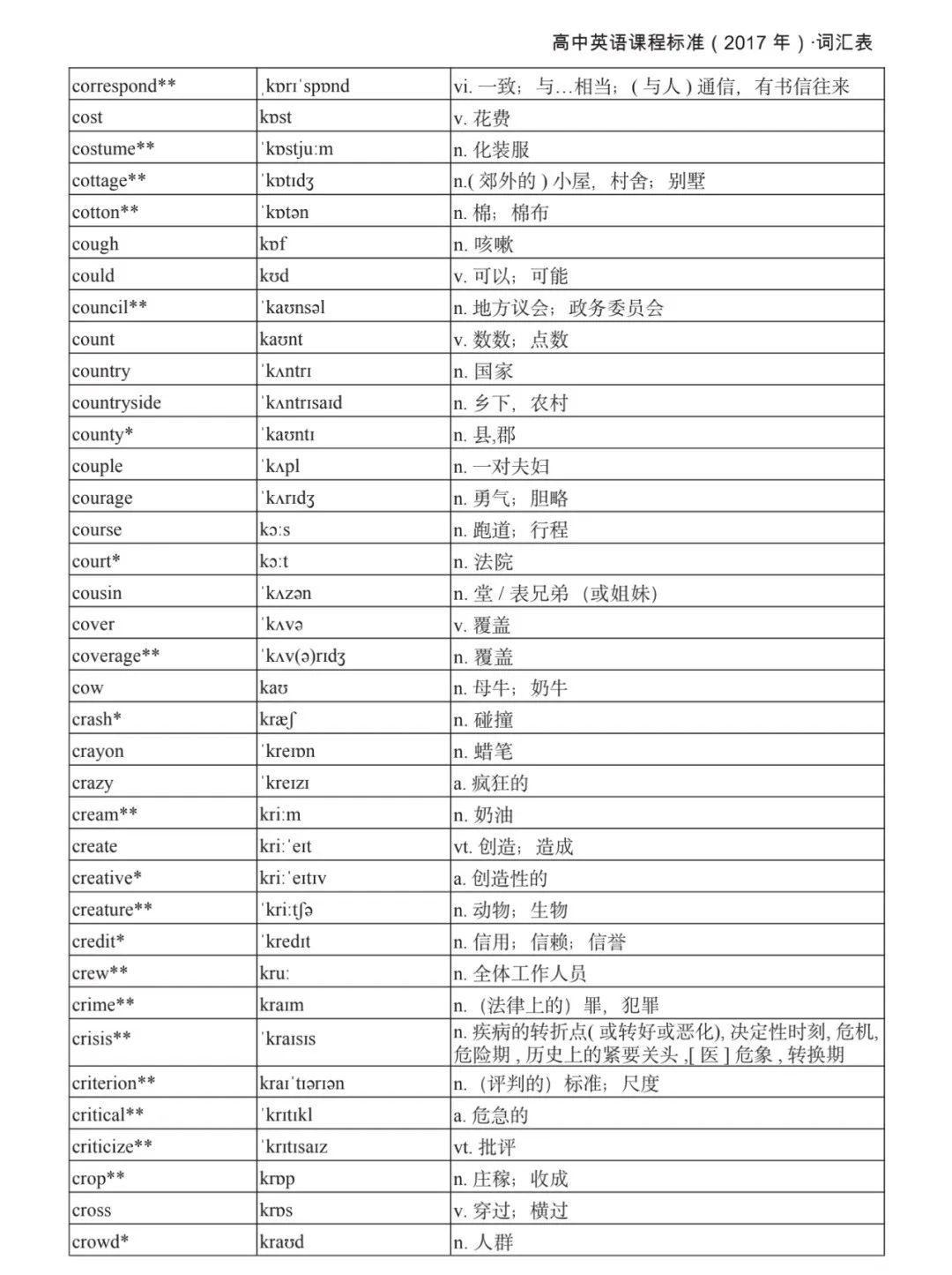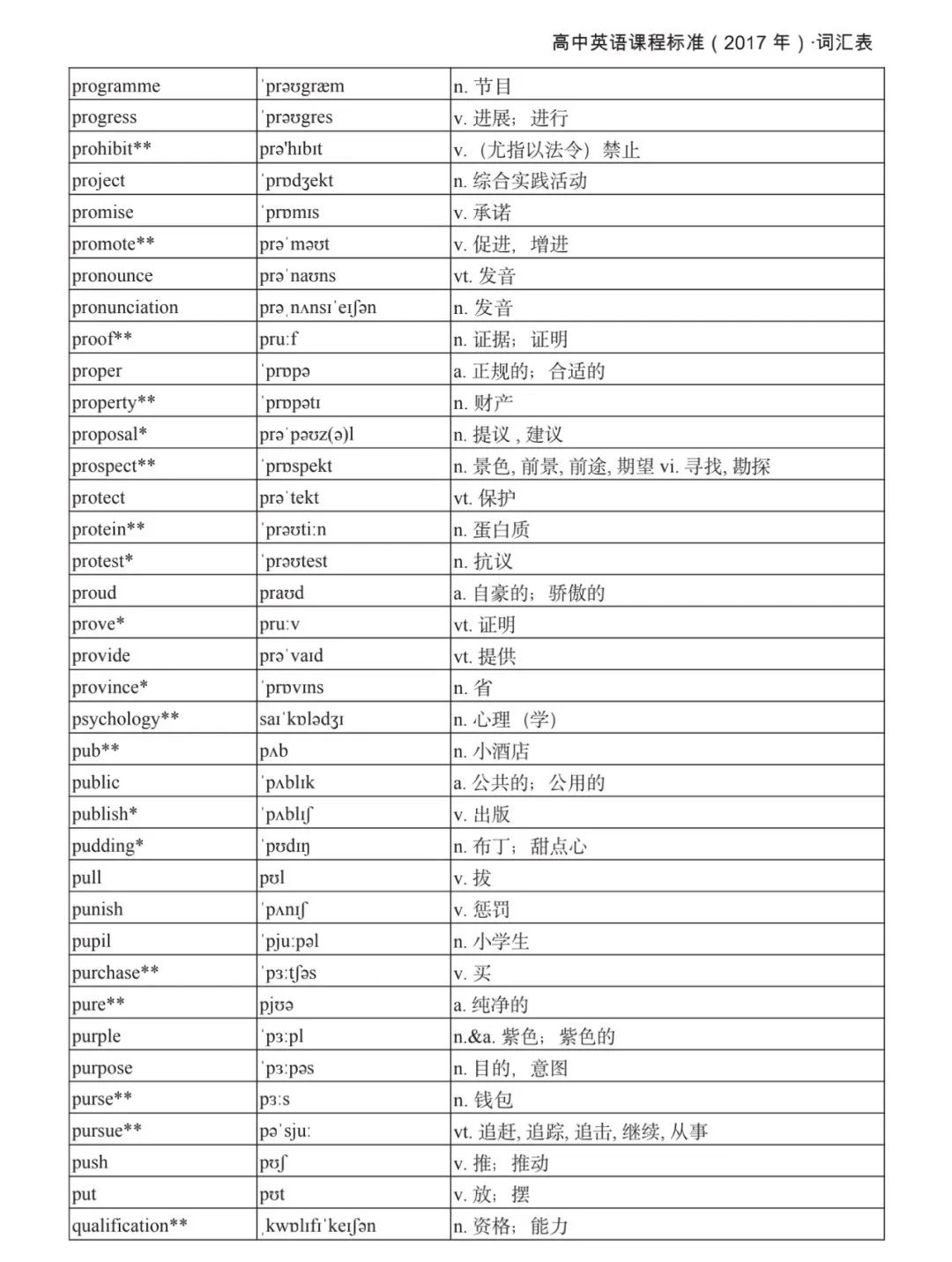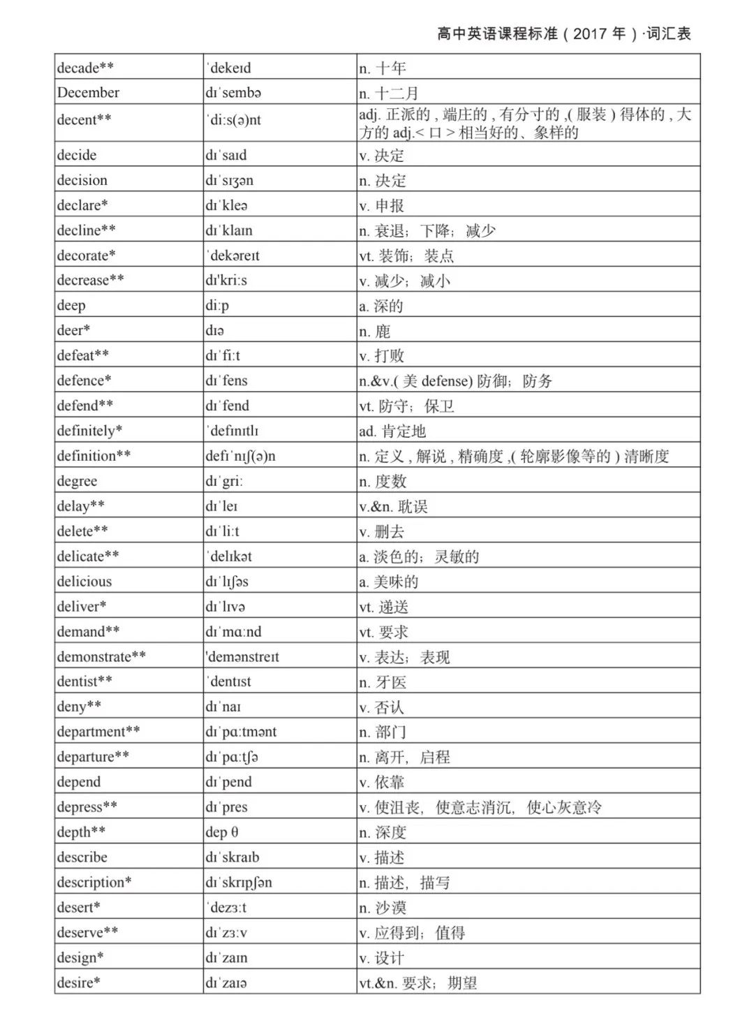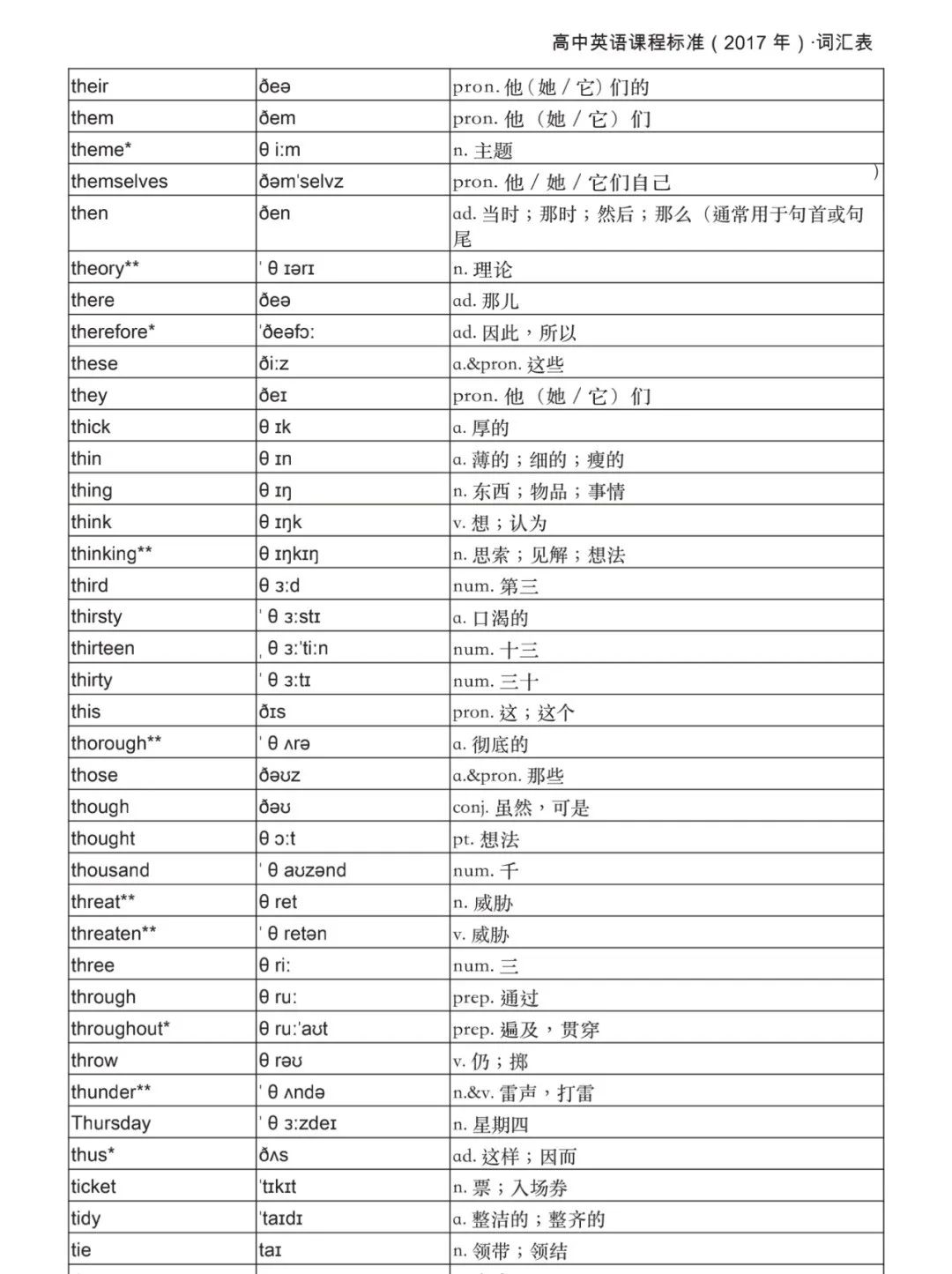 本詞匯表共收 3000 個單詞,含義務(wù)教育階段要求掌握的 1500 個單詞。高中英語必修課程應(yīng)學(xué)習(xí)和掌握 500 個單詞(表中加有一個 * 號),累計達 2000。選擇性必修課程應(yīng)學(xué)習(xí)和掌握 1000 個單詞(表中加有兩個 *號),累計達 3000。各地可根據(jù)實際情況在本詞匯表所收詞的基礎(chǔ)上,再選擇增加 200 個單詞。