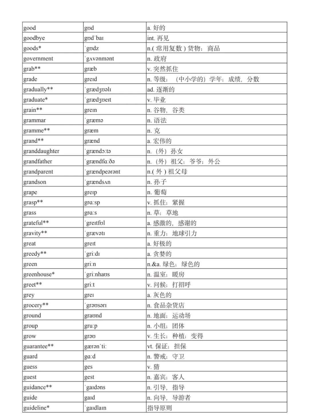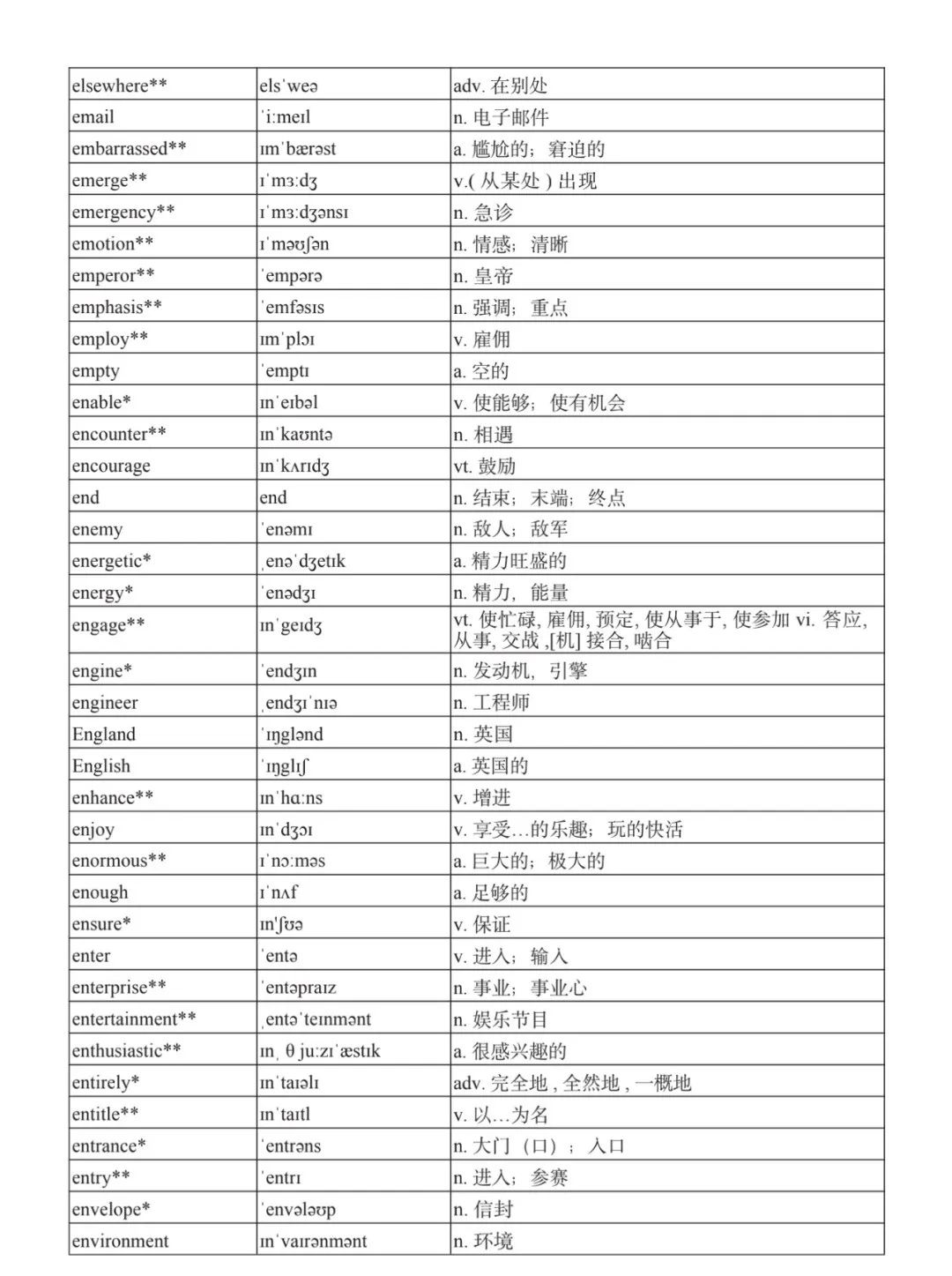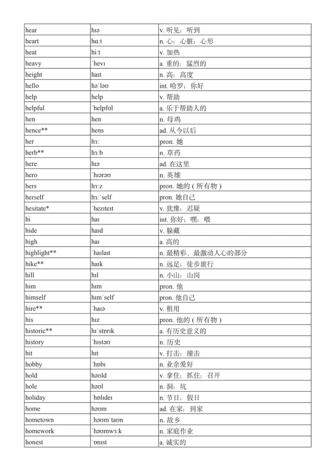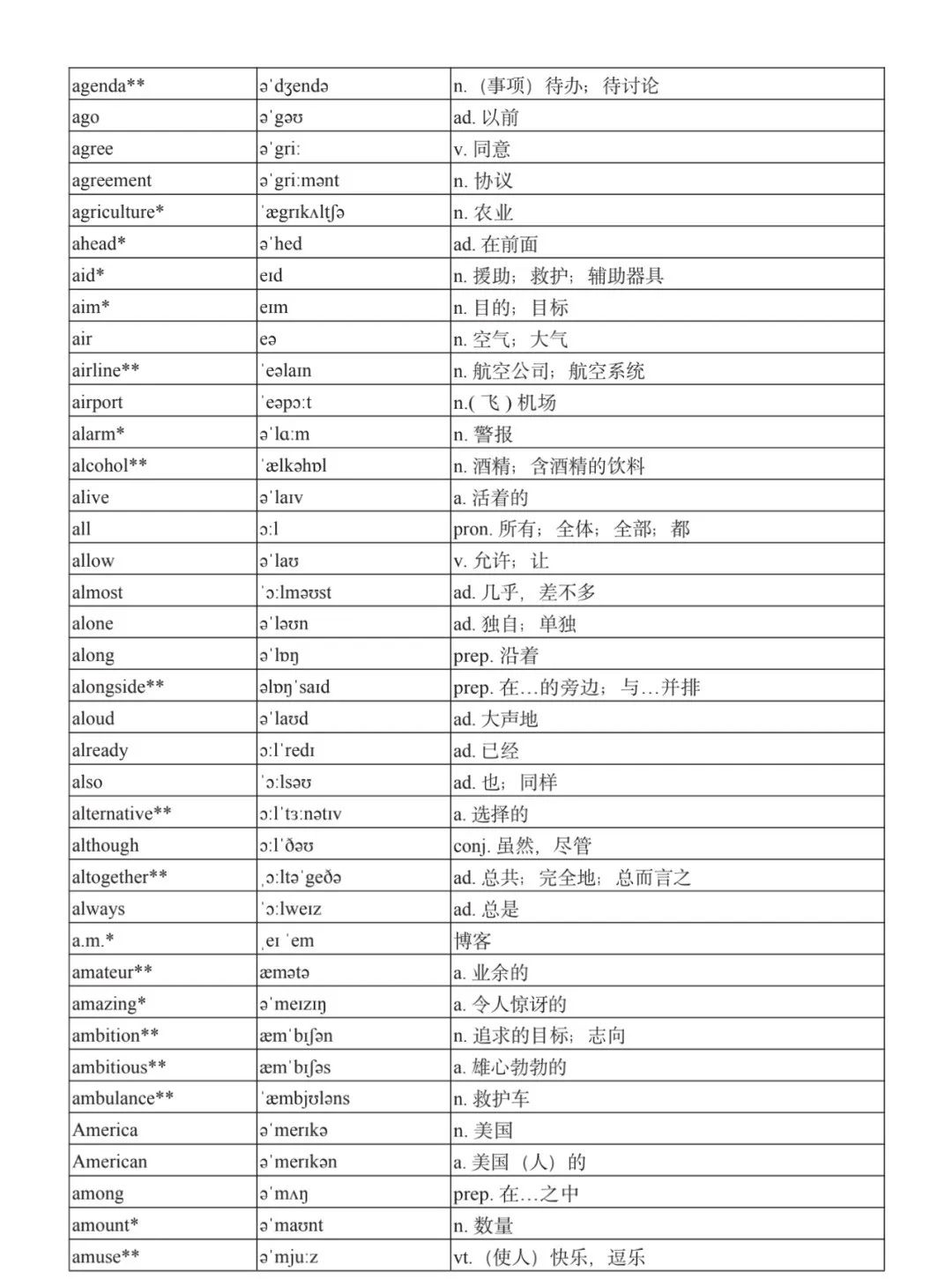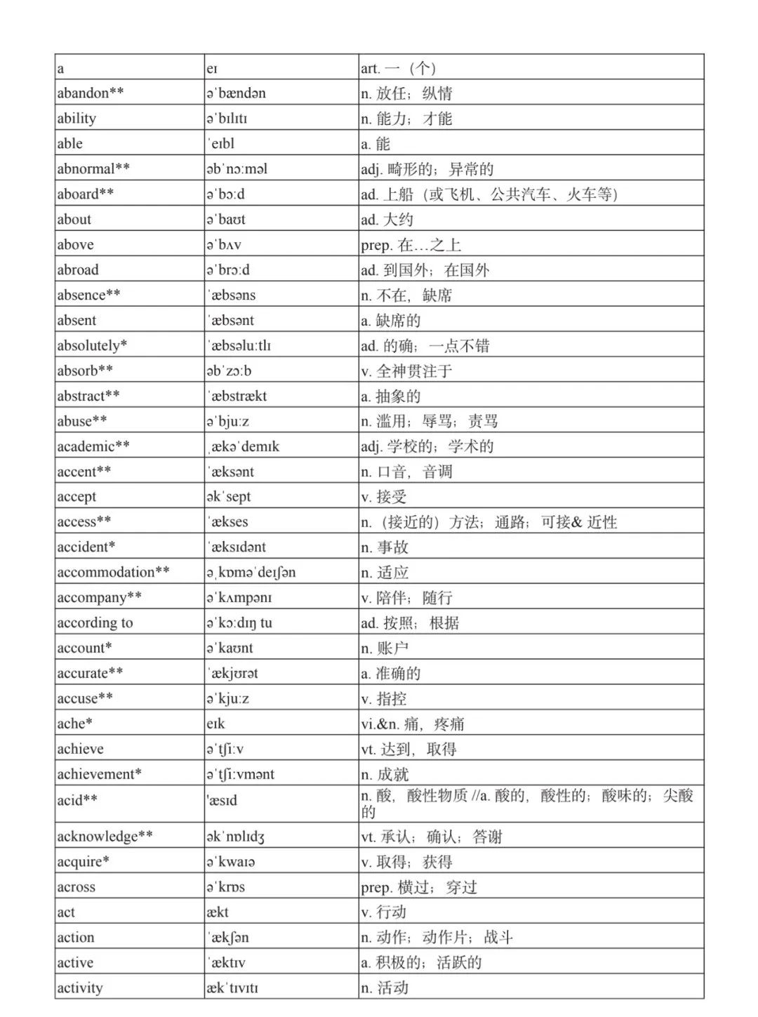本詞匯表共收 3000 個單詞,含義務(wù)教育階段要求掌握的 1500 個單詞。高中英語必修課程應(yīng)學(xué)習(xí)和掌握 500 個單詞(表中加有一個 * 號),累計達 2000。選擇性必修課程應(yīng)學(xué)習(xí)和掌握 1000 個單詞(表中加有兩個 *號),累計達 3000。各地可根據(jù)實際情況在本詞匯表所收詞的基礎(chǔ)上,再選擇增加 200 個單詞。