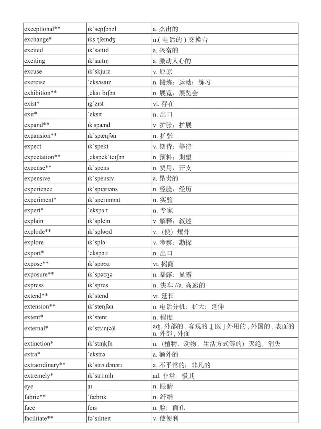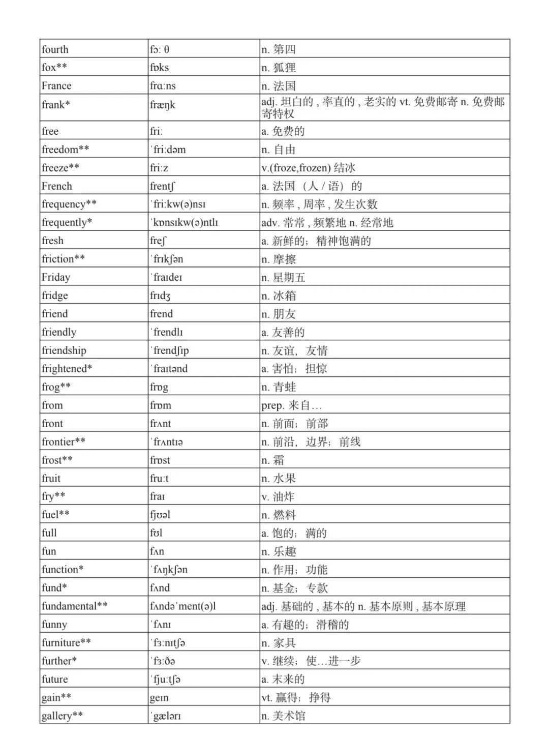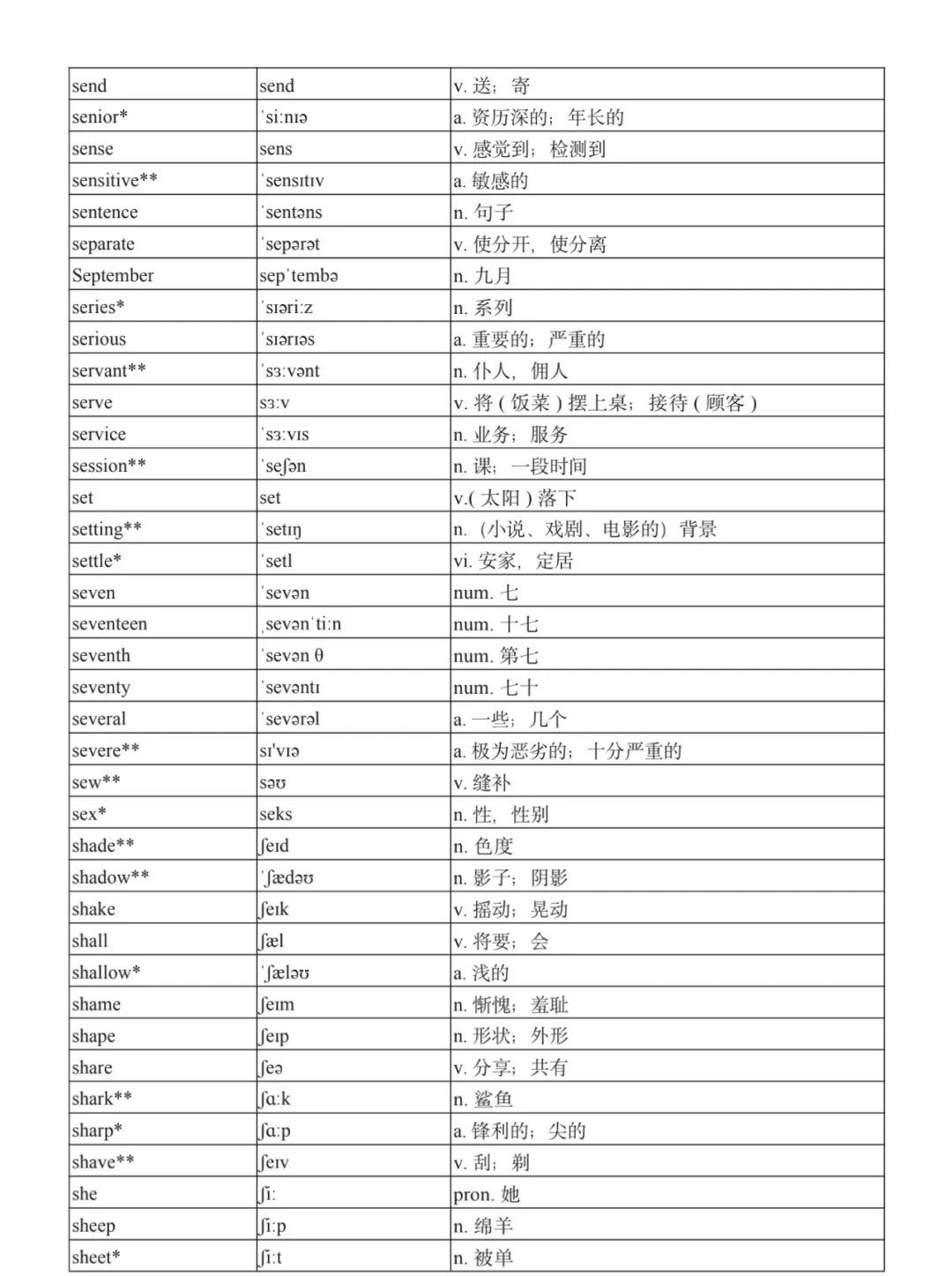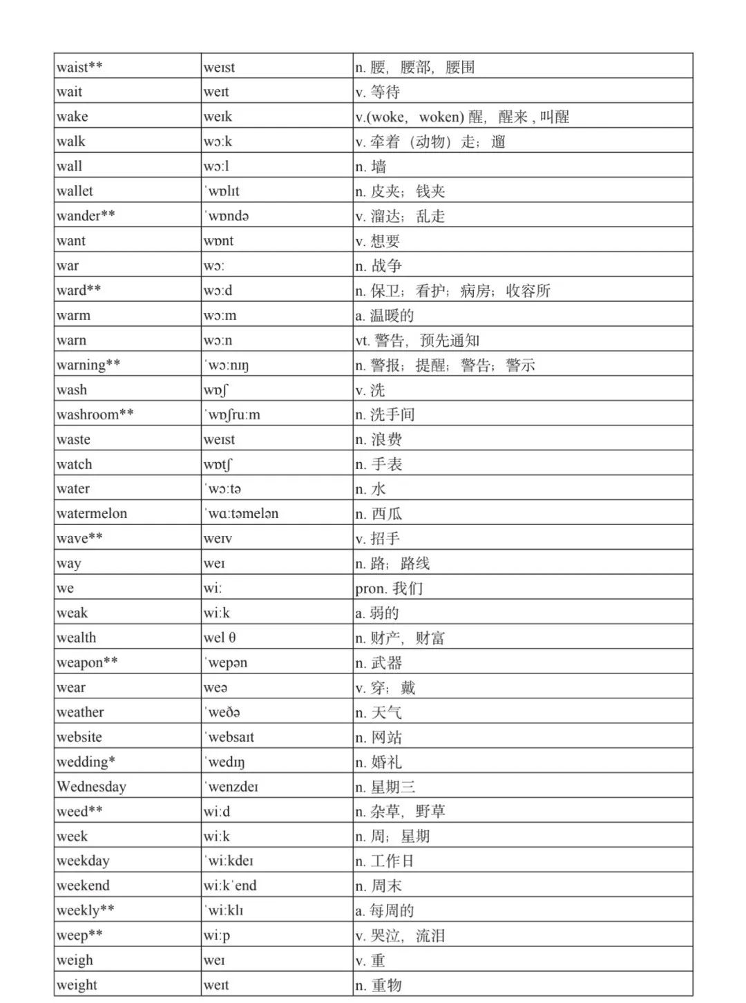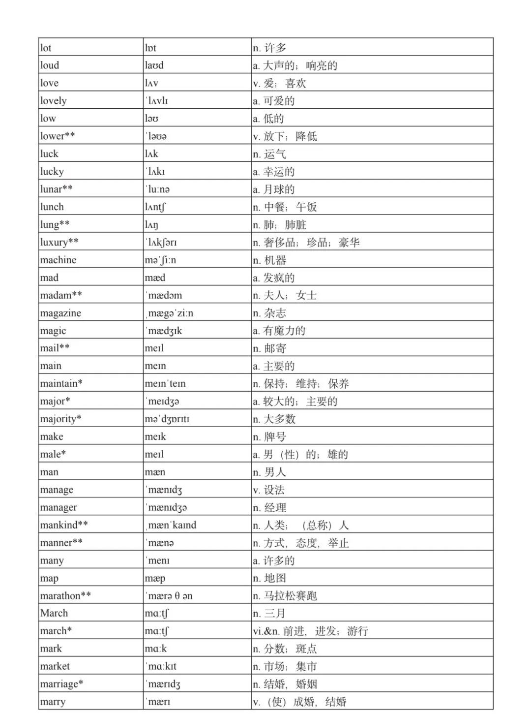 本詞匯表共收 3000 個單詞,含義務(wù)教育階段要求掌握的 1500 個單詞。高中英語必修課程應(yīng)學(xué)習(xí)和掌握 500 個單詞(表中加有一個 * 號),累計達 2000。選擇性必修課程應(yīng)學(xué)習(xí)和掌握 1000 個單詞(表中加有兩個 *號),累計達 3000。各地可根據(jù)實際情況在本詞匯表所收詞的基礎(chǔ)上,再選擇增加 200 個單詞。