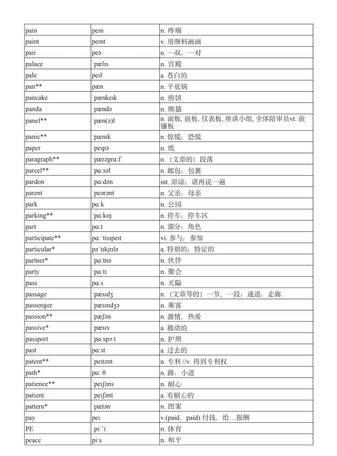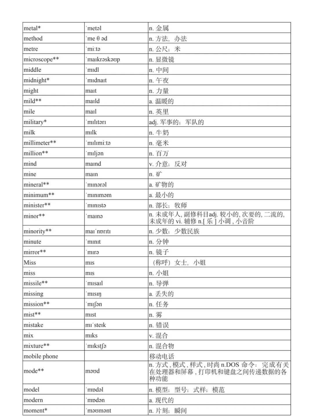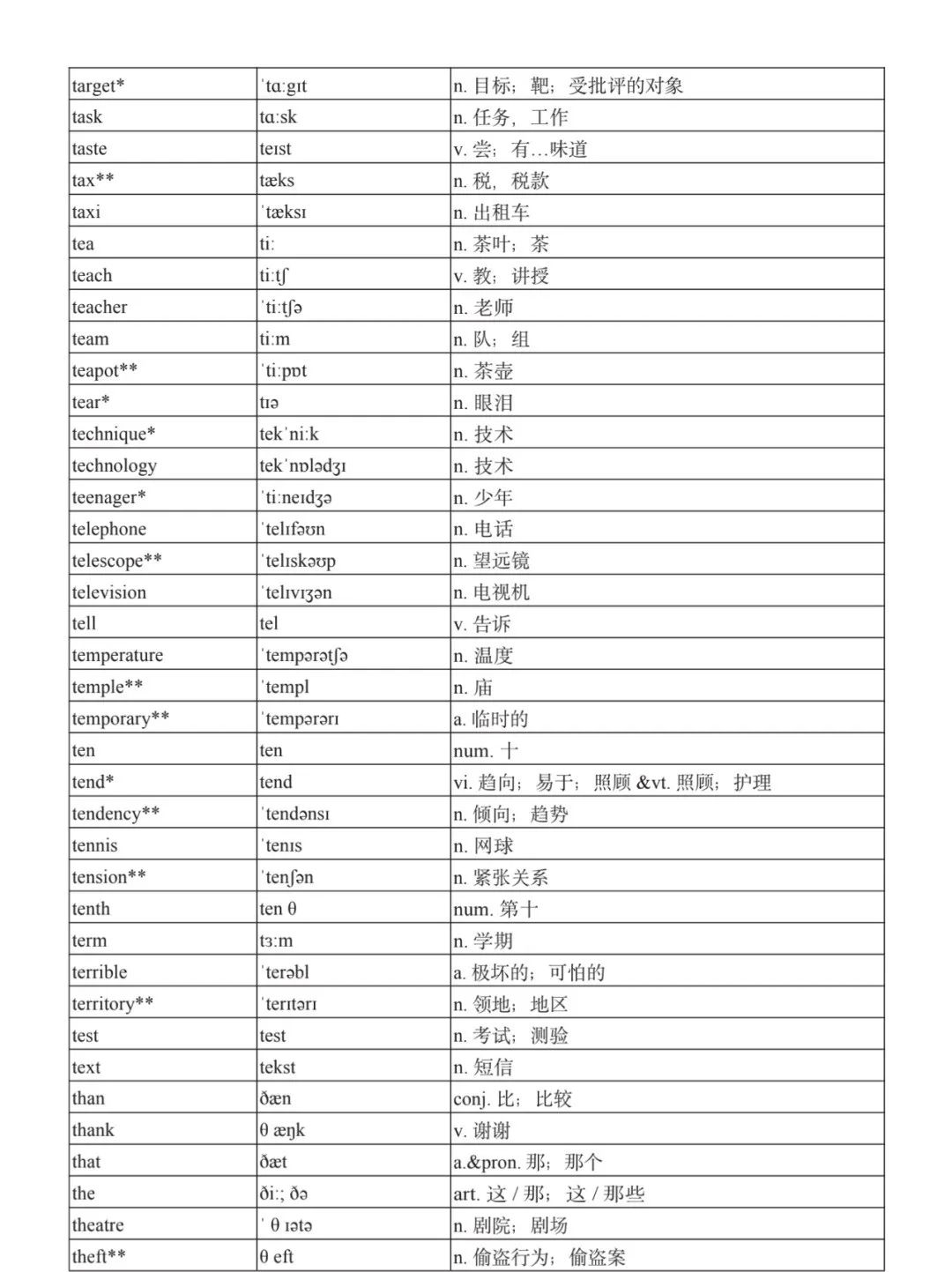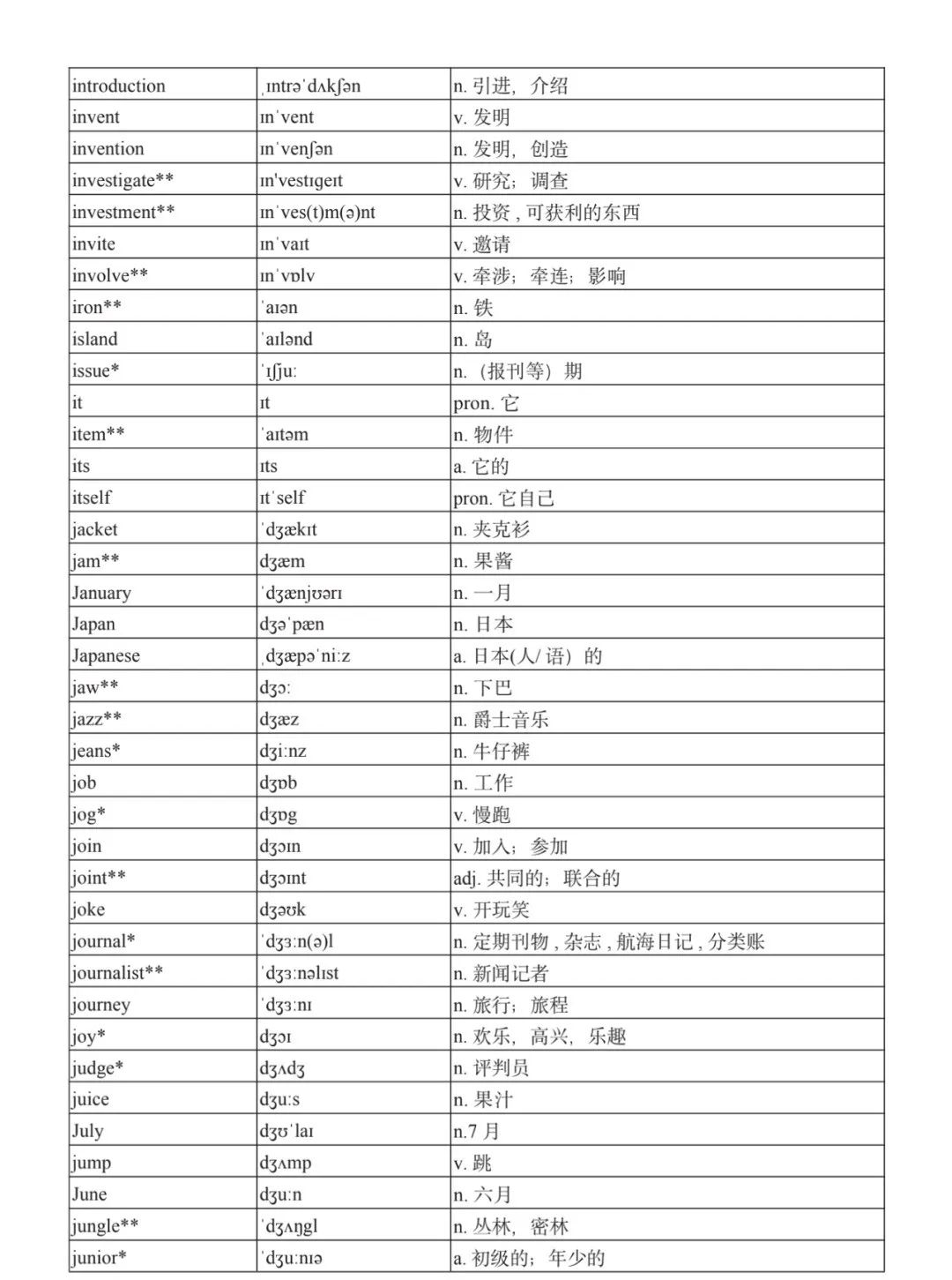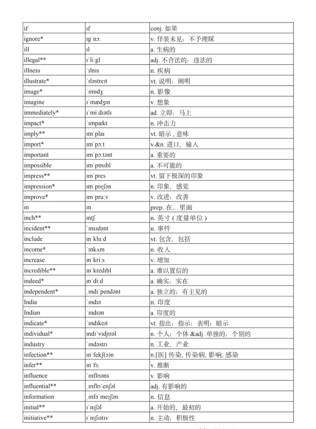 本詞匯表共收 3000 個單詞,含義務(wù)教育階段要求掌握的 1500 個單詞。高中英語必修課程應(yīng)學(xué)習(xí)和掌握 500 個單詞(表中加有一個 * 號),累計達 2000。選擇性必修課程應(yīng)學(xué)習(xí)和掌握 1000 個單詞(表中加有兩個 *號),累計達 3000。各地可根據(jù)實際情況在本詞匯表所收詞的基礎(chǔ)上,再選擇增加 200 個單詞。