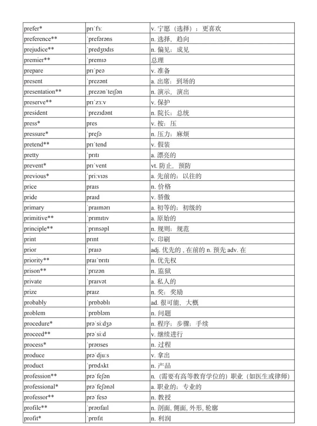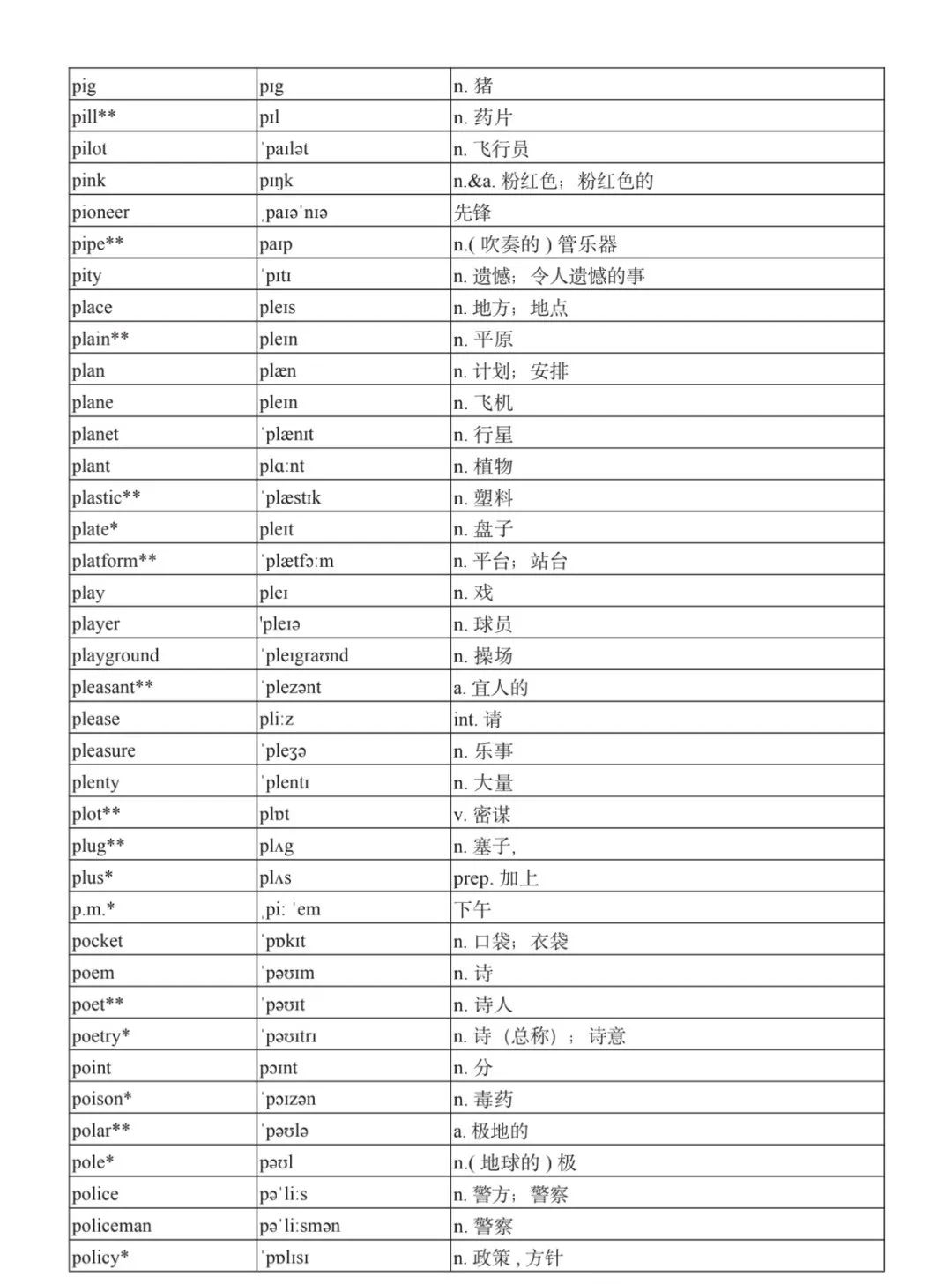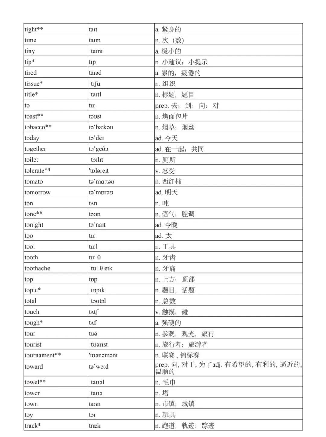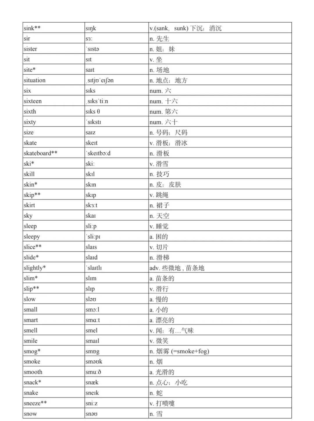本詞匯表共收 3000 個單詞,含義務(wù)教育階段要求掌握的 1500 個單詞。高中英語必修課程應(yīng)學(xué)習(xí)和掌握 500 個單詞(表中加有一個 * 號),累計達 2000。選擇性必修課程應(yīng)學(xué)習(xí)和掌握 1000 個單詞(表中加有兩個 *號),累計達 3000。各地可根據(jù)實際情況在本詞匯表所收詞的基礎(chǔ)上,再選擇增加 200 個單詞。