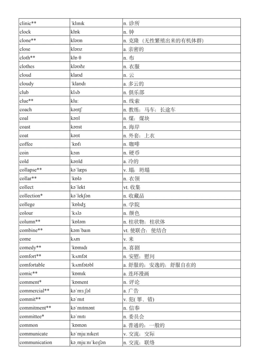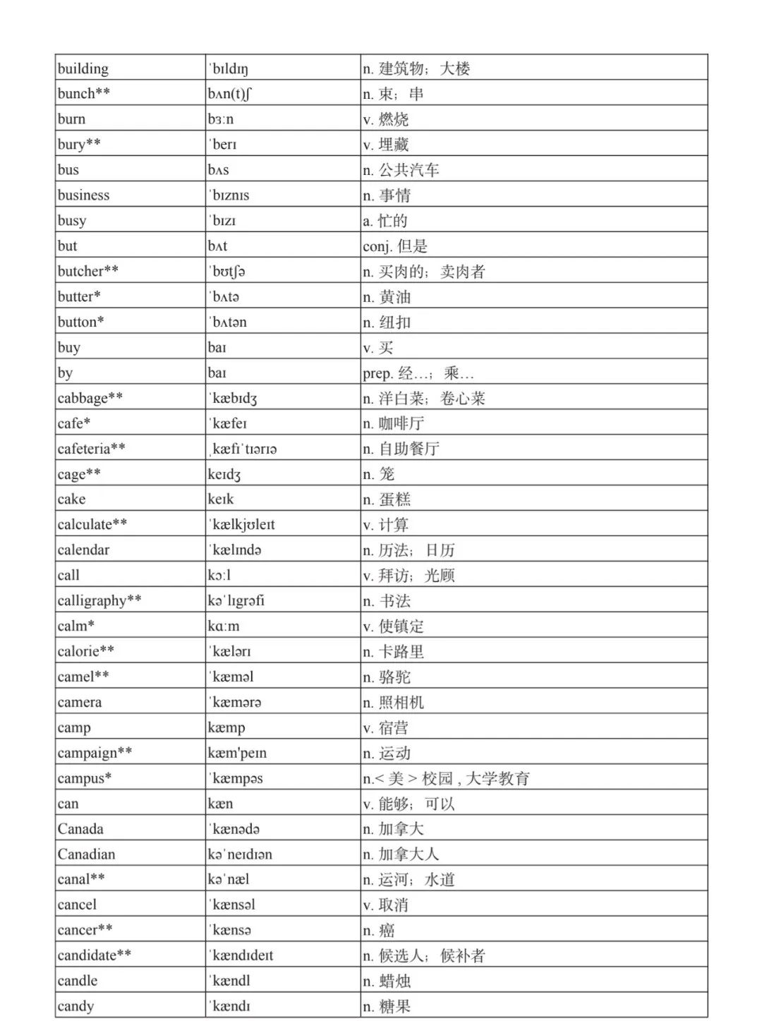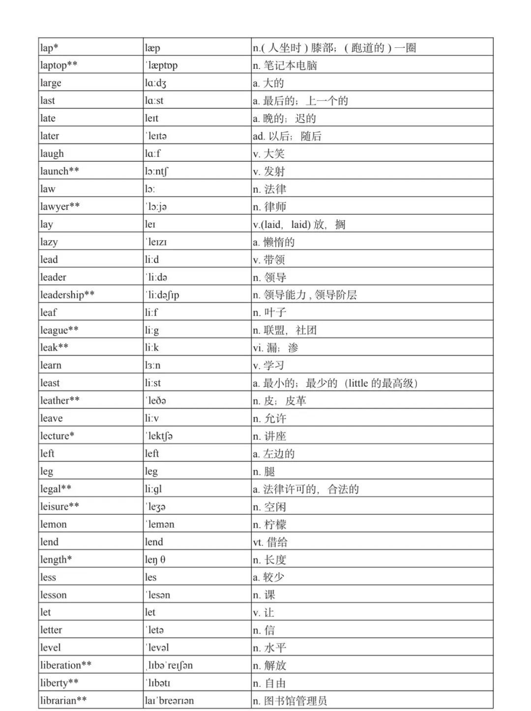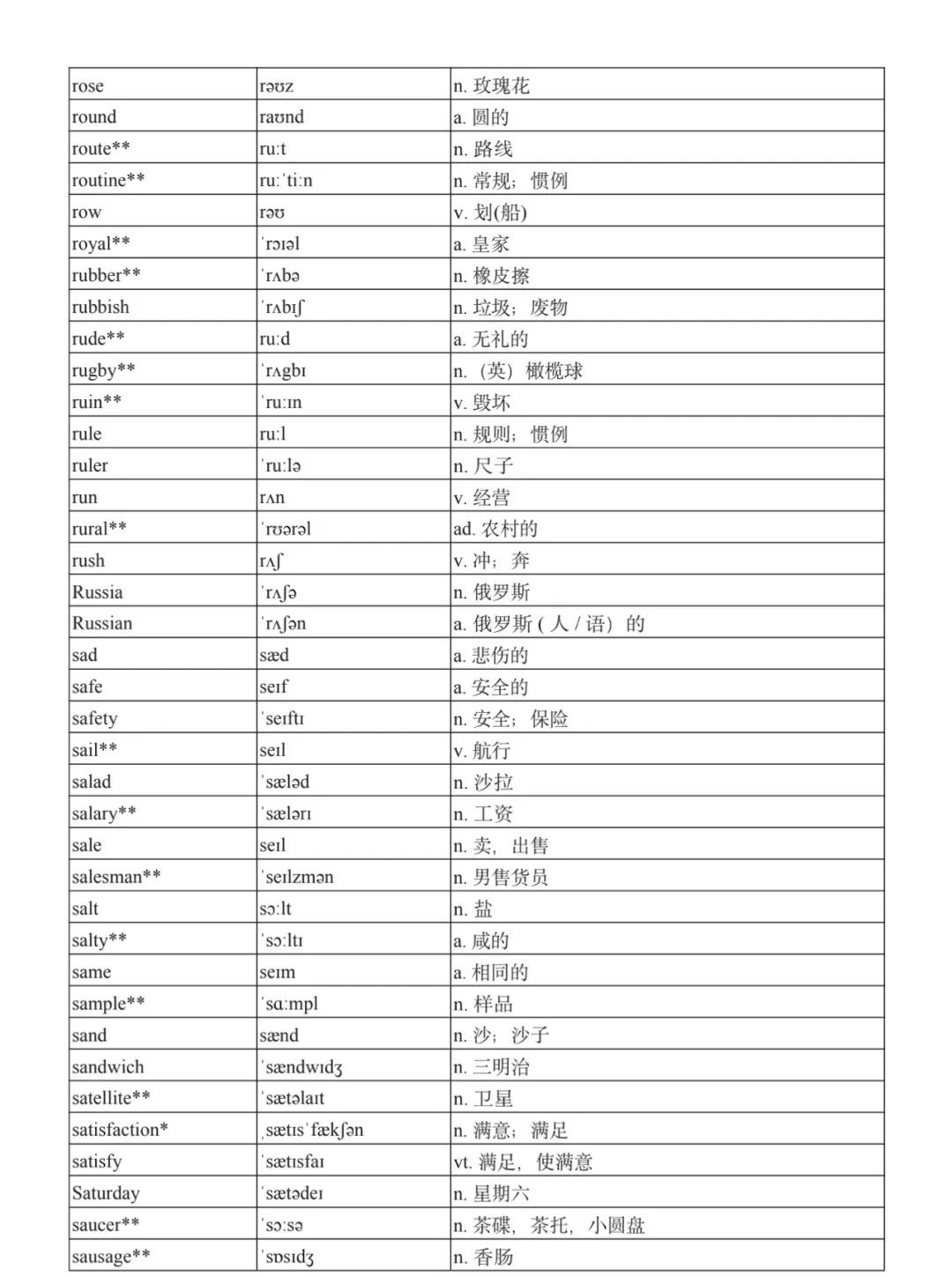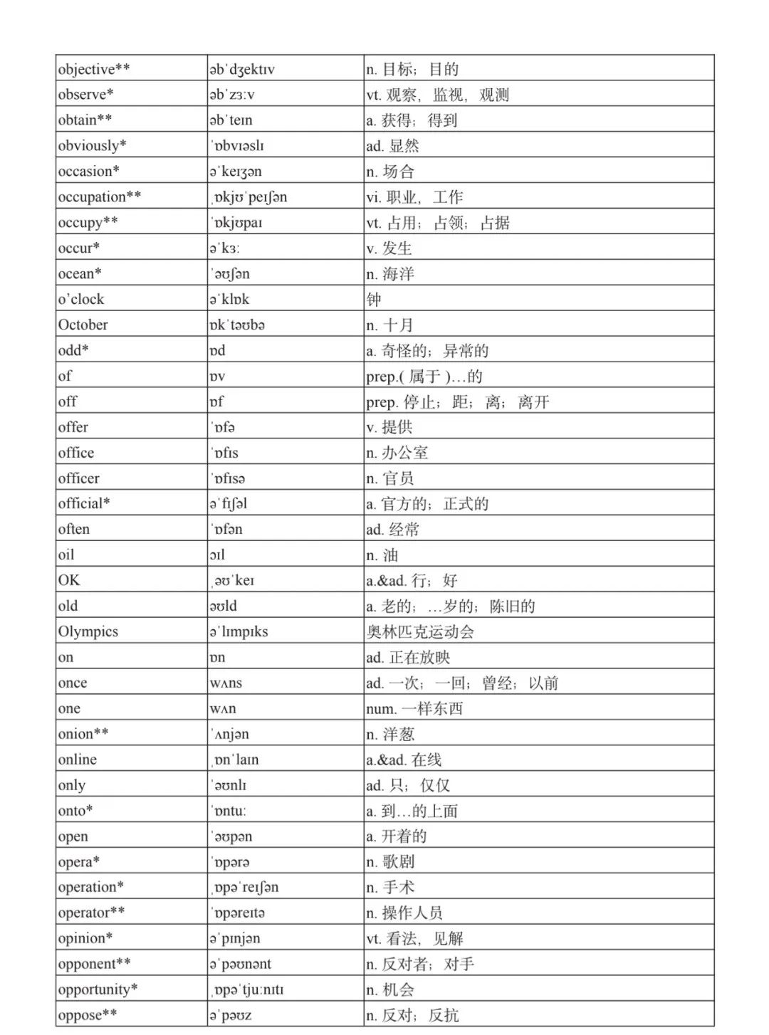 本詞匯表共收 3000 個單詞,含義務(wù)教育階段要求掌握的 1500 個單詞。高中英語必修課程應(yīng)學(xué)習(xí)和掌握 500 個單詞(表中加有一個 * 號),累計達 2000。選擇性必修課程應(yīng)學(xué)習(xí)和掌握 1000 個單詞(表中加有兩個 *號),累計達 3000。各地可根據(jù)實際情況在本詞匯表所收詞的基礎(chǔ)上,再選擇增加 200 個單詞。