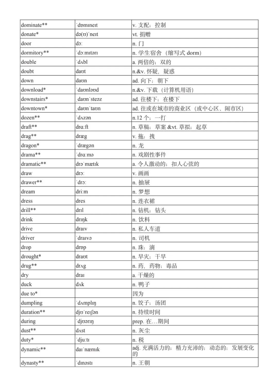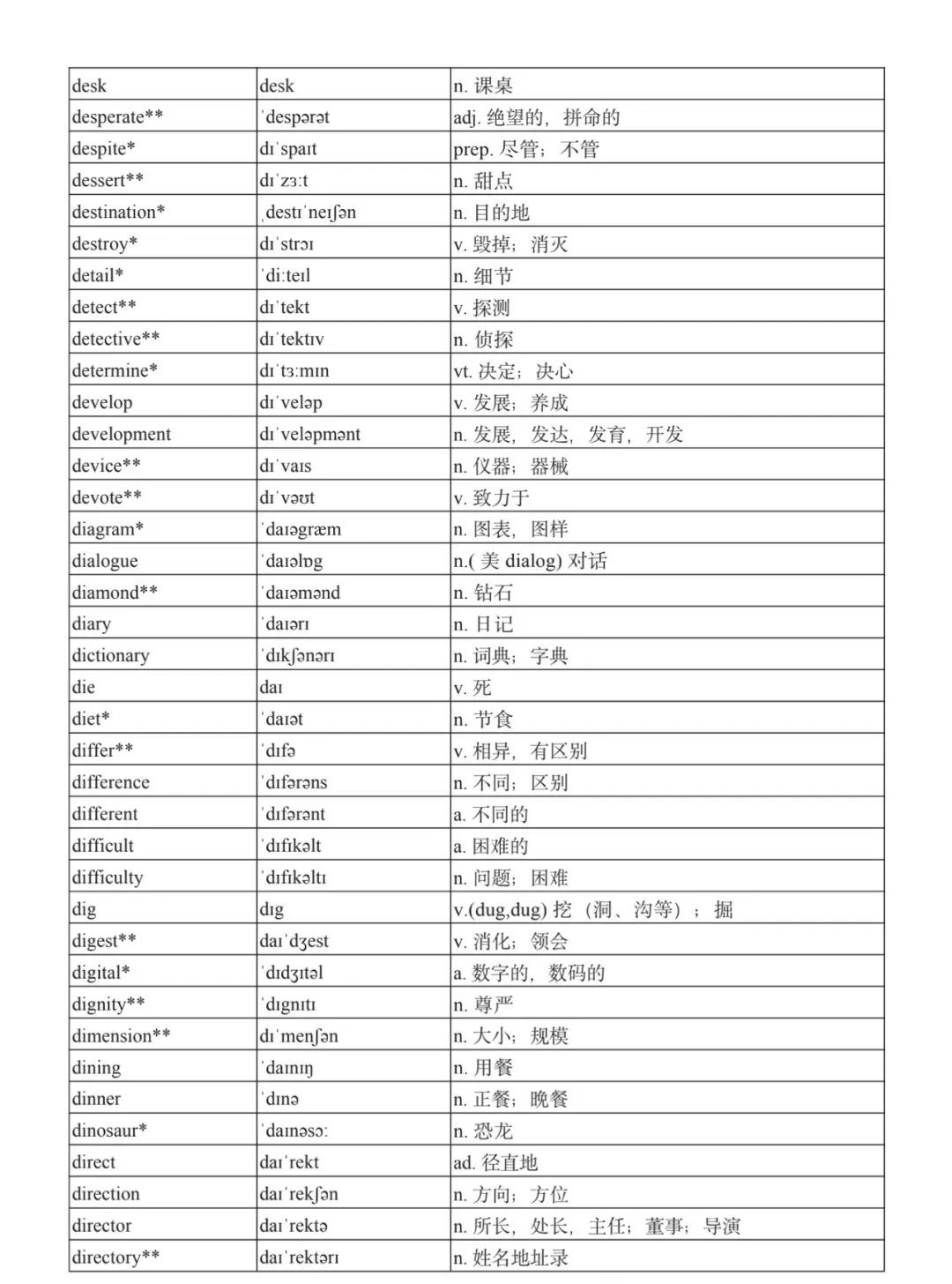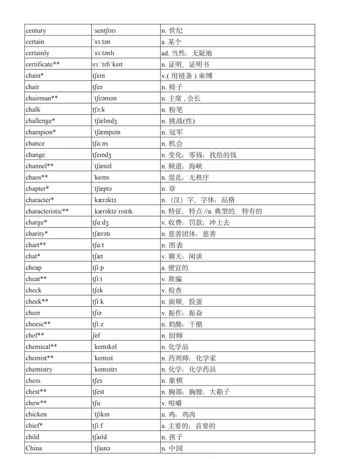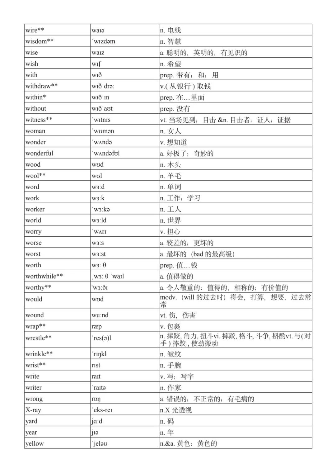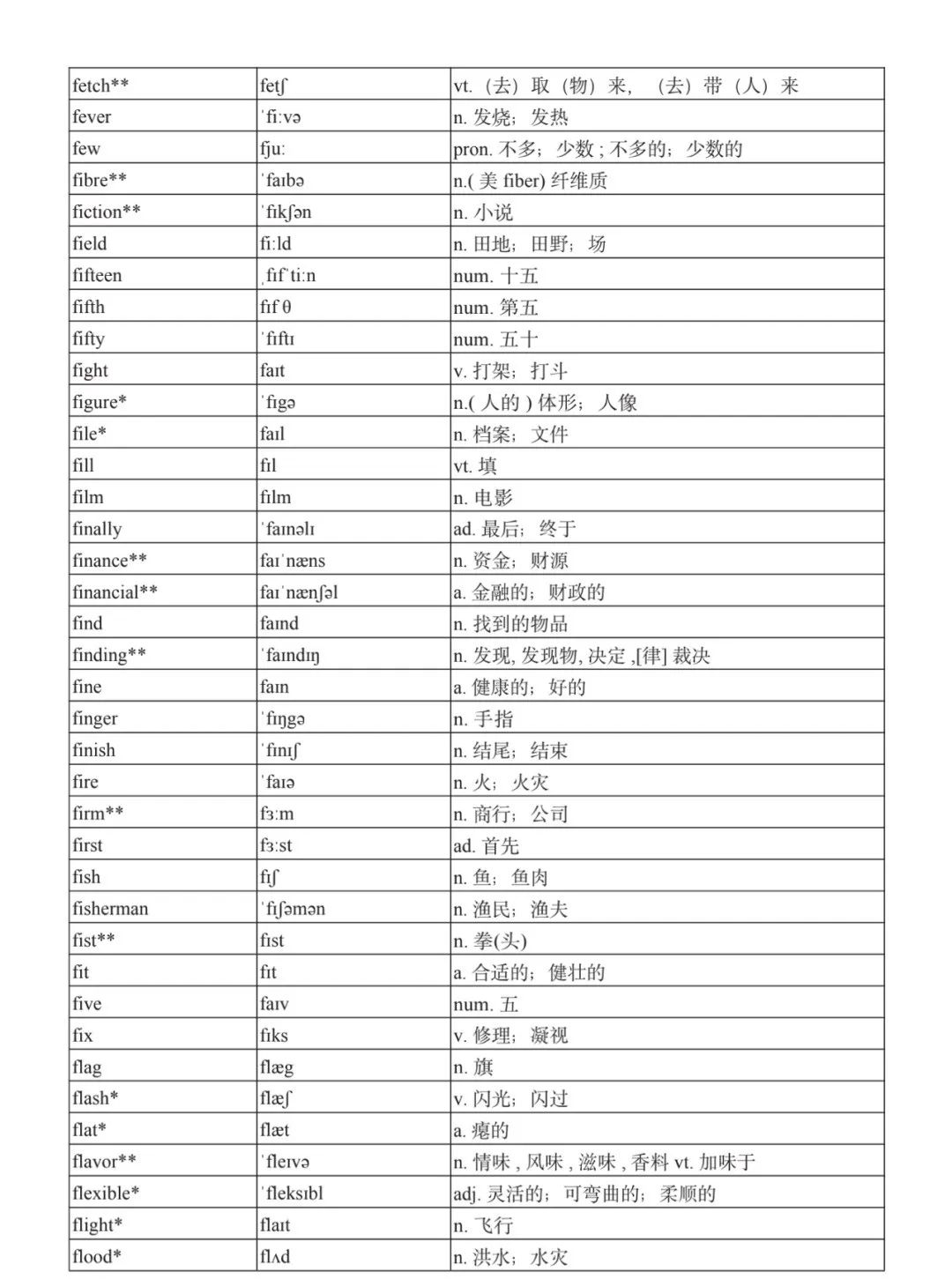 本詞匯表共收 3000 個單詞,含義務(wù)教育階段要求掌握的 1500 個單詞。高中英語必修課程應(yīng)學(xué)習(xí)和掌握 500 個單詞(表中加有一個 * 號),累計達 2000。選擇性必修課程應(yīng)學(xué)習(xí)和掌握 1000 個單詞(表中加有兩個 *號),累計達 3000。各地可根據(jù)實際情況在本詞匯表所收詞的基礎(chǔ)上,再選擇增加 200 個單詞。