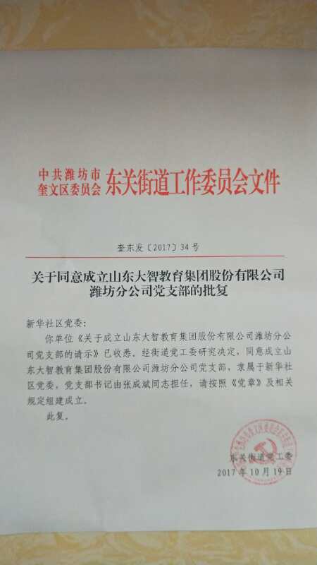 10月19日,中共濰坊市奎文區(qū)東關(guān)街道工作委員會(huì)同意成立山東大智控股集團(tuán)股份有限公司濰坊分公司黨支部。黨支部書(shū)記由張成斌同志擔(dān)任。這是大智控...