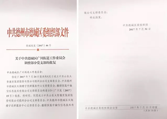 08月02日,中國(guó)共產(chǎn)黨德州市德城區(qū)委組織部正式批復(fù)同意成立中共山東大智控股集團(tuán)股份有限公司德州分公司支部委員會(huì)。 這是大智控股集團(tuán)黨建...