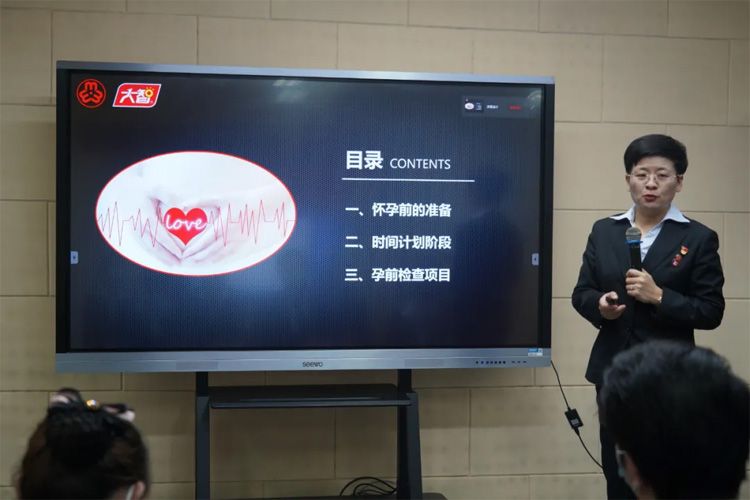 課堂上,孕前指導(dǎo)學(xué)校的組織者——大智控股集團黨委書記、婦聯(lián)主席王現(xiàn)芹從“懷孕前的準備”“時間計劃階段”“孕前檢查項目”三個方面為大家?guī)砹嗽敿毜脑星爸R解讀,同時結(jié)合自身經(jīng)歷,現(xiàn)場為員工們進行答疑解惑。