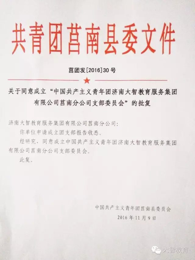 11月09日,中國共產(chǎn)主義青年團莒南縣委員會正式批復(fù)同意成立“中國共產(chǎn)主義青年團濟南大智教育服務(wù)集團有限公司莒南分公司支部委員會”。莒南分公司團支部是繼淄博、臨沂之后,大智成立的第三個區(qū)域團支部,將對大智今后的發(fā)展及各項工作的開展產(chǎn)生積極推動作用。
