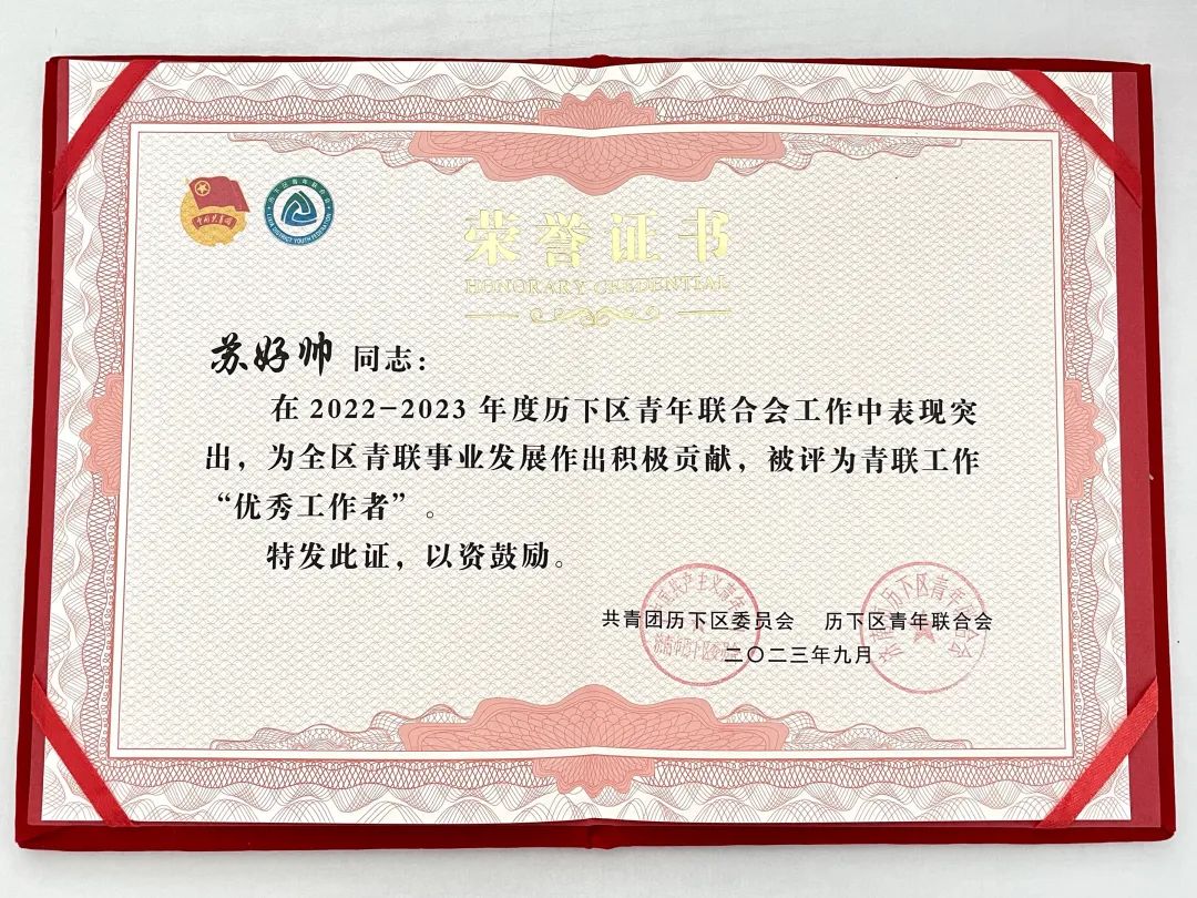 蘇好帥榮獲青聯(lián)工作“優(yōu)秀工作者”稱號