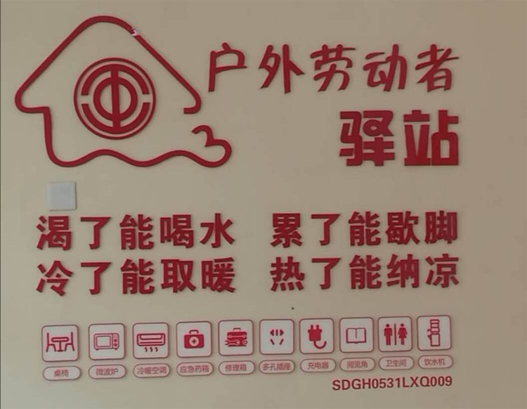 據(jù)悉,“戶外勞動者驛站”是山東省總工會在全省范圍內(nèi)持續(xù)推動建設(shè)的重點(diǎn)項目,旨在為廣大戶外勞動者提供服務(wù)。驛站建成后,將以環(huán)衛(wèi)工、快遞員、協(xié)管員等戶外職工為主要服務(wù)對象,內(nèi)部設(shè)飲水機(jī)、空調(diào)、微波、沙發(fā)等生活設(shè)施,配備手機(jī)充電器、便民工具箱、醫(yī)療藥箱等,可有效解決戶外職工的飲水、避暑取暖、如廁、手機(jī)充電等生活實(shí)際需求,為廣大戶外勞動者提供實(shí)實(shí)在在的溫暖與關(guān)懷。